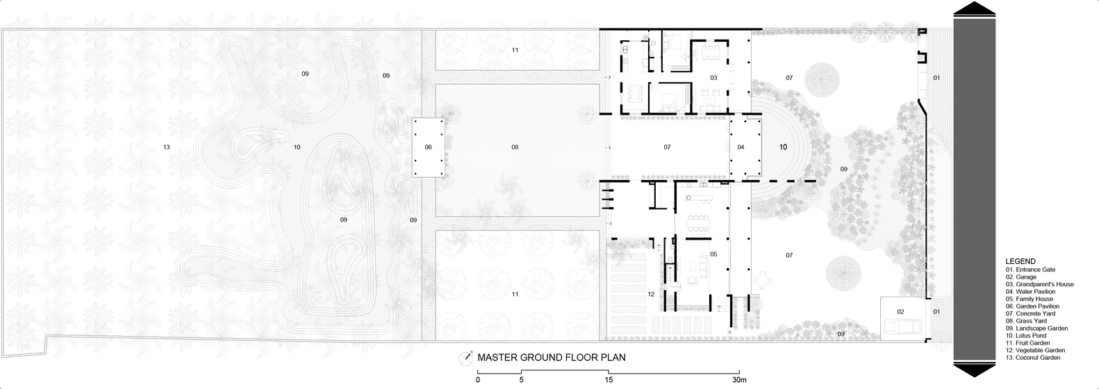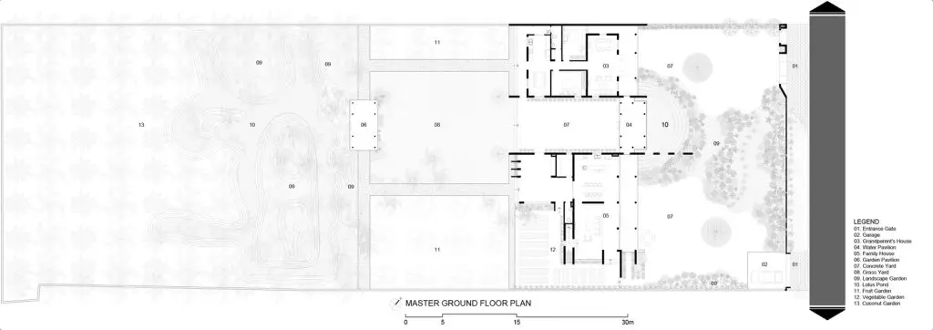 1. Bối cảnh và Thách thức: Touch House tọa lạc tại vùng Đồng bằng sông Cửu Long, Việt Nam – một vùng đất được hình thành bởi khí hậu nhiệt đới gió mùa với mùa khô và mùa mưa rõ rệt. Ngôi nhà phải đối mặt với một thách thức kép: làm thế nào để sống hòa hợp với thiên nhiên mà vẫn đáp ứng được nhu cầu của một gia đình đa thế hệ. Ngôi nhà nằm giữa một vùng nông thôn yên bình. Phía đông bắc giáp với một con đường nội bộ yên tĩnh, và cả hai bên đều được bao quanh bởi những ngôi nhà lân cận. Tuy nhiên, phía tây bắc lại mở ra một rừng dừa cổ thụ rậm rạp và một hệ sinh thái tự nhiên gồm ao hồ và kênh rạch. Cảnh quan này mang đến một cơ hội độc đáo: tận hưởng vẻ đẹp của thiên nhiên trong khi vẫn cân bằng giữa thiết kế đương đại với bản sắc địa phương.