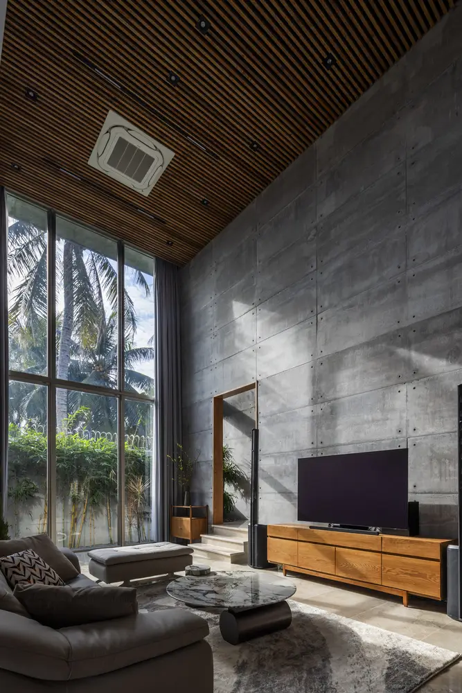 3. Vật liệu – Linh hồn của thiết kế: Một trong những đặc điểm nổi bật nhất của Touch House là việc sử dụng bê tông thô. Thường bị coi là thô ráp hoặc lạnh lẽo, ở đây, bê tông lại trở thành một vật liệu sống động. Bề mặt bê tông được xử lý cẩn thận để duy trì kết cấu nguyên bản, đồng thời đủ mịn màng để kể một câu chuyện, giống như một cuộn phim ghi lại từng khoảnh khắc. Khi ánh sáng tự nhiên chạm vào các bức tường, chúng trở nên sống động. Ánh sáng mặt trời lướt nhẹ trên bê tông, tạo nên những họa tiết chuyển động và lặng lẽ đánh dấu sự trôi chảy của thời gian. Sự tương phản giữa vẻ thô ráp của bê tông và sự ấm áp của trần gỗ tạo nên một không gian hiện đại, thanh lịch, vững chắc và đậm chất nhân văn.