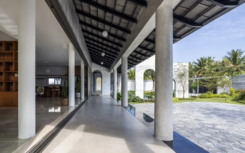 4. Không gian mở và trải nghiệm liền mạch: Touch House được thiết kế để xóa nhòa ranh giới giữa bên trong và bên ngoài. Một chuỗi bảy khoảng sân – cả lớn lẫn nhỏ – cùng mái dốc dài làm dịu ánh sáng, dẫn hướng gió và tạo nên một trải nghiệm không gian liền mạch, trôi chảy. Một chi tiết tinh tế là mặt sàn liền mạch từ hiên nhà vào bên trong. Điều này tạo nên cảm giác chuyển động mượt mà, không bị gián đoạn, không chỉ về mặt thể chất mà còn về mặt cảm xúc.