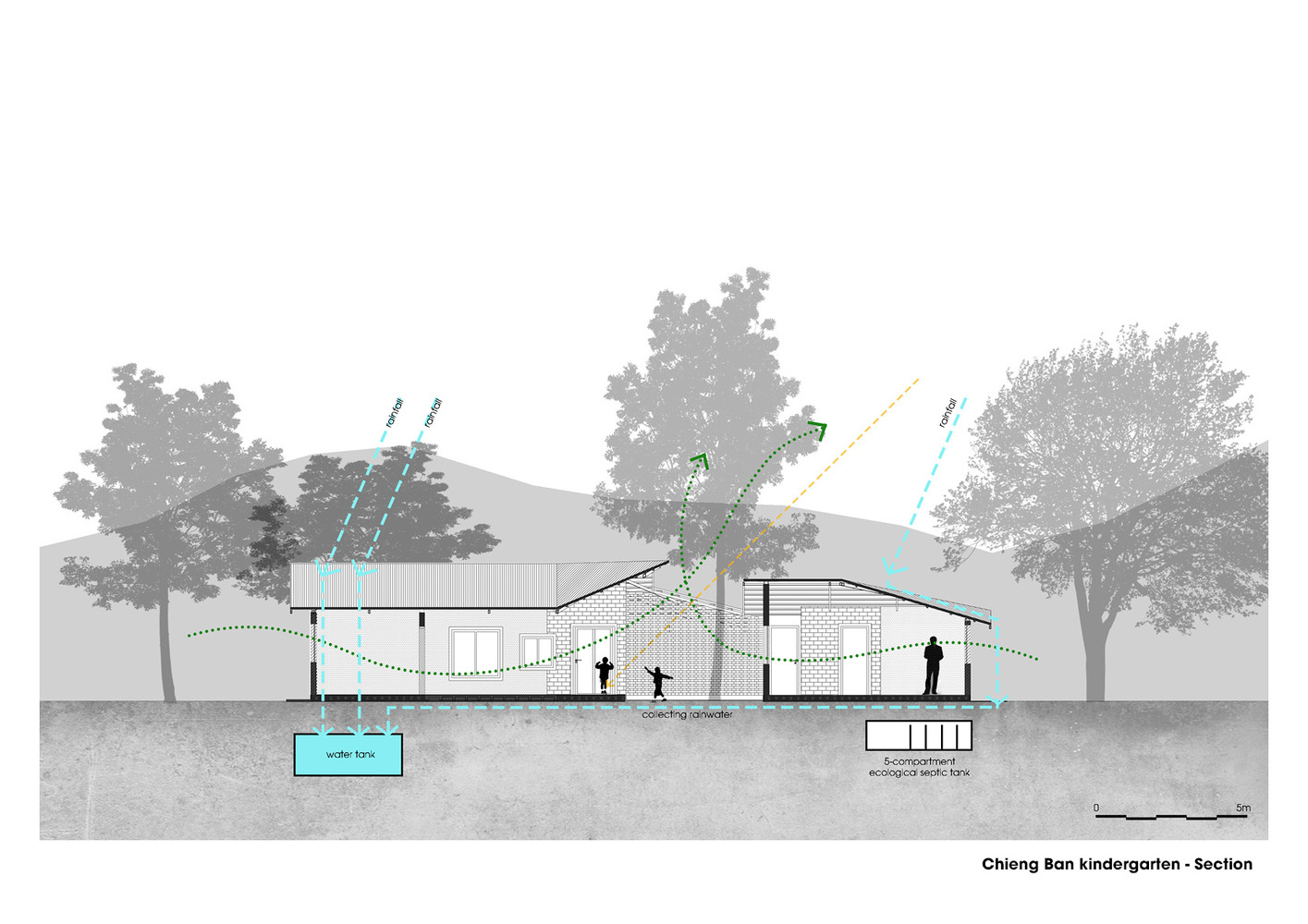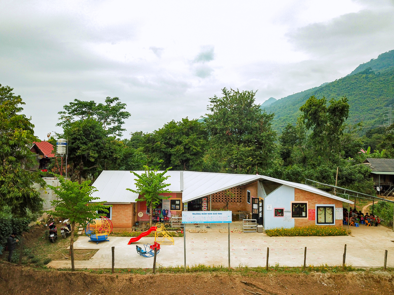 Một mái nhà lớn, bao trùm, hợp nhất hai phòng học và sân trung tâm, vừa che nắng che mưa, vừa tạo nên không gian sinh hoạt chung, thúc đẩy sự tương tác giữa giáo viên và học sinh. Khu vệ sinh được thiết kế với tường gạch đục lỗ ở cả hai mặt, đảm bảo luồng không khí lưu thông hiệu quả và duy trì môi trường thông thoáng, vệ sinh.
