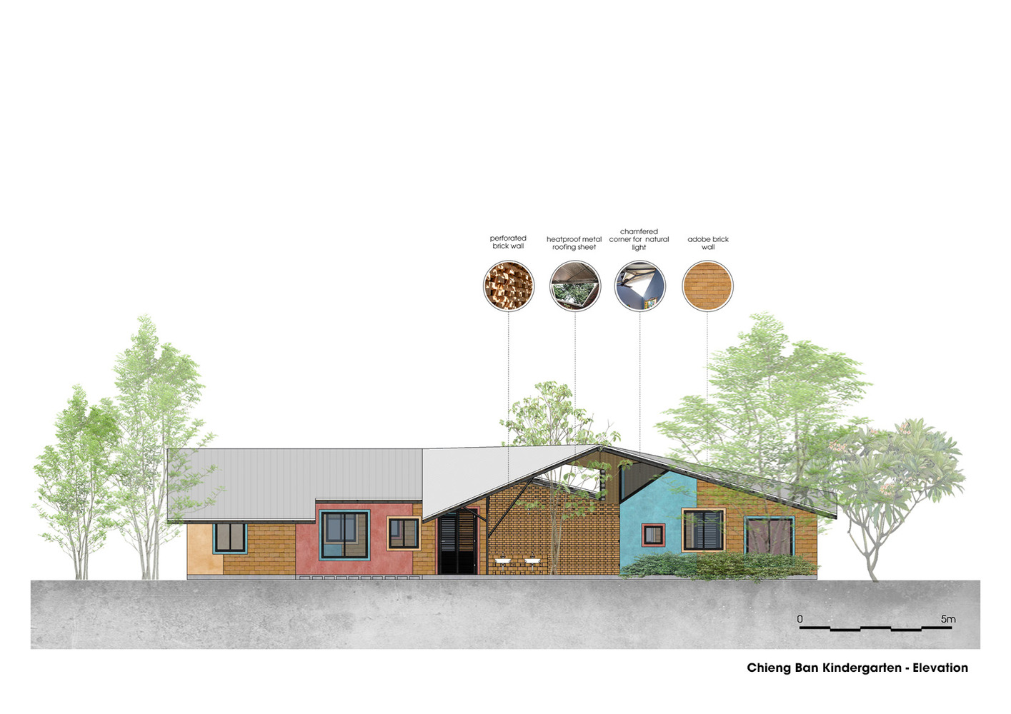 Mô tả văn bản do kiến trúc sư cung cấp. Trường Mẫu giáo Chiềng Ban bao gồm hai phòng học, hai nhà vệ sinh, một phòng giáo viên và một hành lang có mái che kiêm khu vui chơi. Trường được bao quanh bởi những bức tường gạch, điểm xuyết bằng các bề mặt sơn màu rực rỡ, tạo nên một môi trường sống động nhưng vẫn thân thiện với trẻ em. Việc bố trí các cửa sổ vuông vức với kích thước và chiều cao khác nhau không chỉ tạo nên nhịp điệu thị giác hấp dẫn mà còn tối ưu hóa ánh sáng tự nhiên và thông gió.