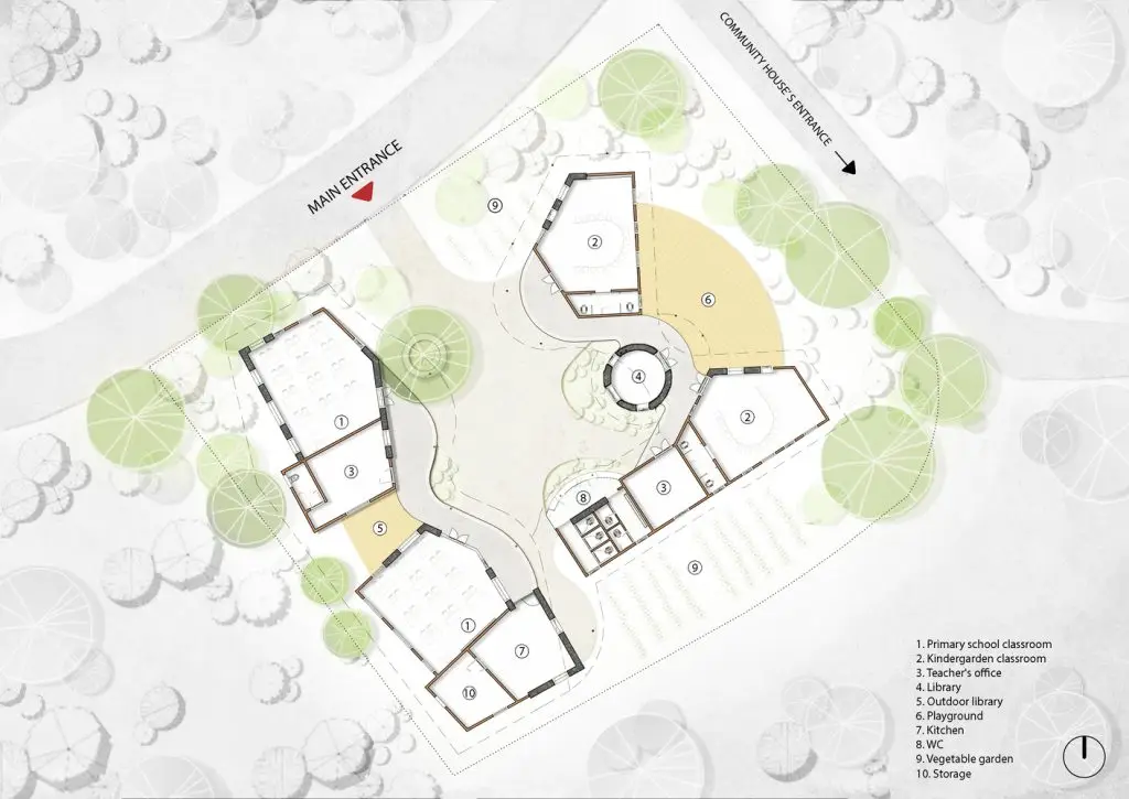 Tọa lạc ở vị trí chiến lược ngay trung tâm làng, ngôi trường mới phục vụ hơn 100 trẻ em, trở thành cả môi trường học tập và điểm nhấn sống động trong khung cảnh núi non rộng lớn. Công trình bao gồm bốn phòng học, hai khu nhà ở cho giáo viên và hai nhà bếp dùng chung cho cả mẫu giáo và tiểu học. Hình dáng kiến ​​trúc hòa quyện vào làng mạc và địa hình xung quanh, được định hình bởi các khối chức năng lồng ghép vào nhau, thống nhất dưới một mái kim loại cong rộng lớn che chắn sân chính và sân chơi của trường mẫu giáo. Mái nhà này tự tạo bóng mát, tăng cường thông gió và đón nhận ánh sáng tự nhiên dồi dào.