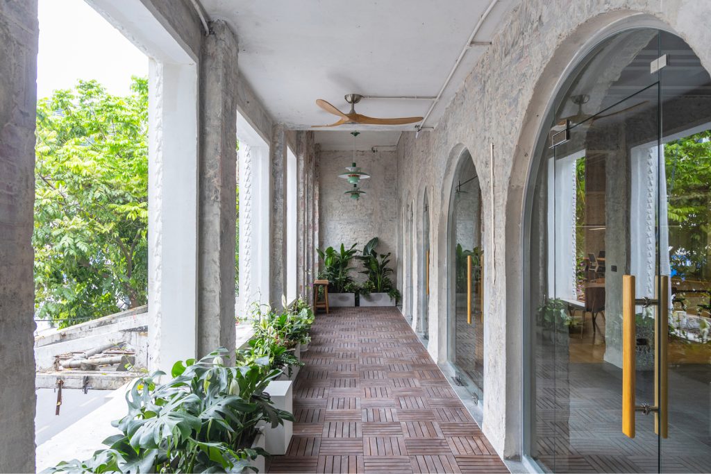Một trong những nét đặc trưng nhất của tòa nhà – không gian ban công chuyển tiếp đặc trưng của kiến trúc thuộc địa Hà Nội – đã được tái hiện. Ban công từng là không gian ngưỡng cửa đã được cải tạo thành phòng đọc sách và phòng họp xanh mát với cây xanh địa phương và ánh sáng tự nhiên. Giờ đây, ban công như một điểm tựa vững chắc cho không gian làm việc với không gian xanh yên bình, kết nối quá khứ và hiện tại. Những mái vòm gạch nguyên bản trên ban công đã được cải tạo để tôn vinh kiến trúc tân cổ điển Pháp.
