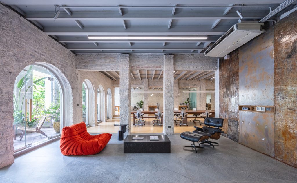 Bố cục không gian văn phòng hỗ trợ sự linh hoạt và hợp tác. Phòng họp được phân chia bằng tường kính, giúp giữ tầm nhìn bao quát toàn bộ không gian và giữ cho kết cấu gạch ban đầu luôn rõ ràng. Không gian làm việc mở được bố trí dọc theo trục trung tâm, với sàn gỗ ấm áp và nội thất tông màu trung tính, tạo nên một không gian nội thất cân bằng và tiện dụng. Hệ thống âm thanh, ánh sáng và điều hòa không khí được tích hợp một cách kín đáo vào khung trần hiện có để duy trì sự thông thoáng cho không gian.