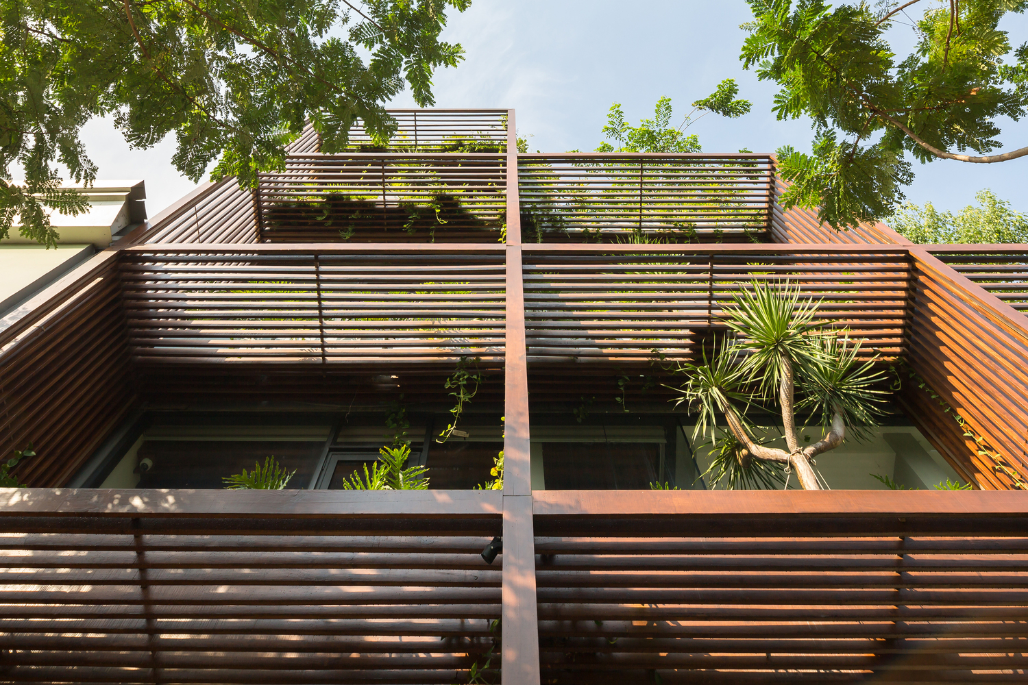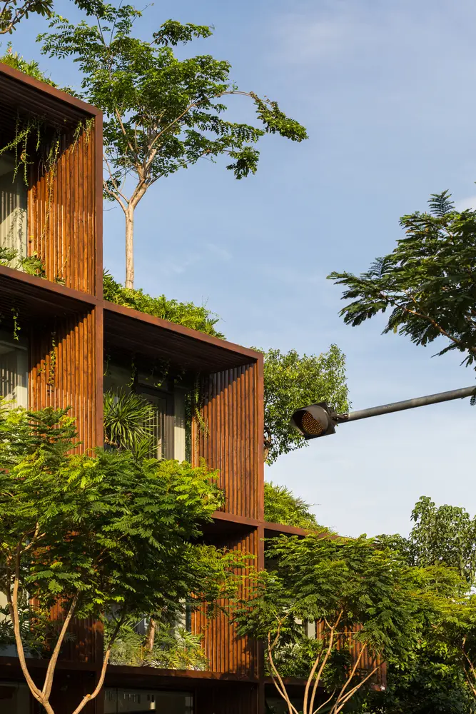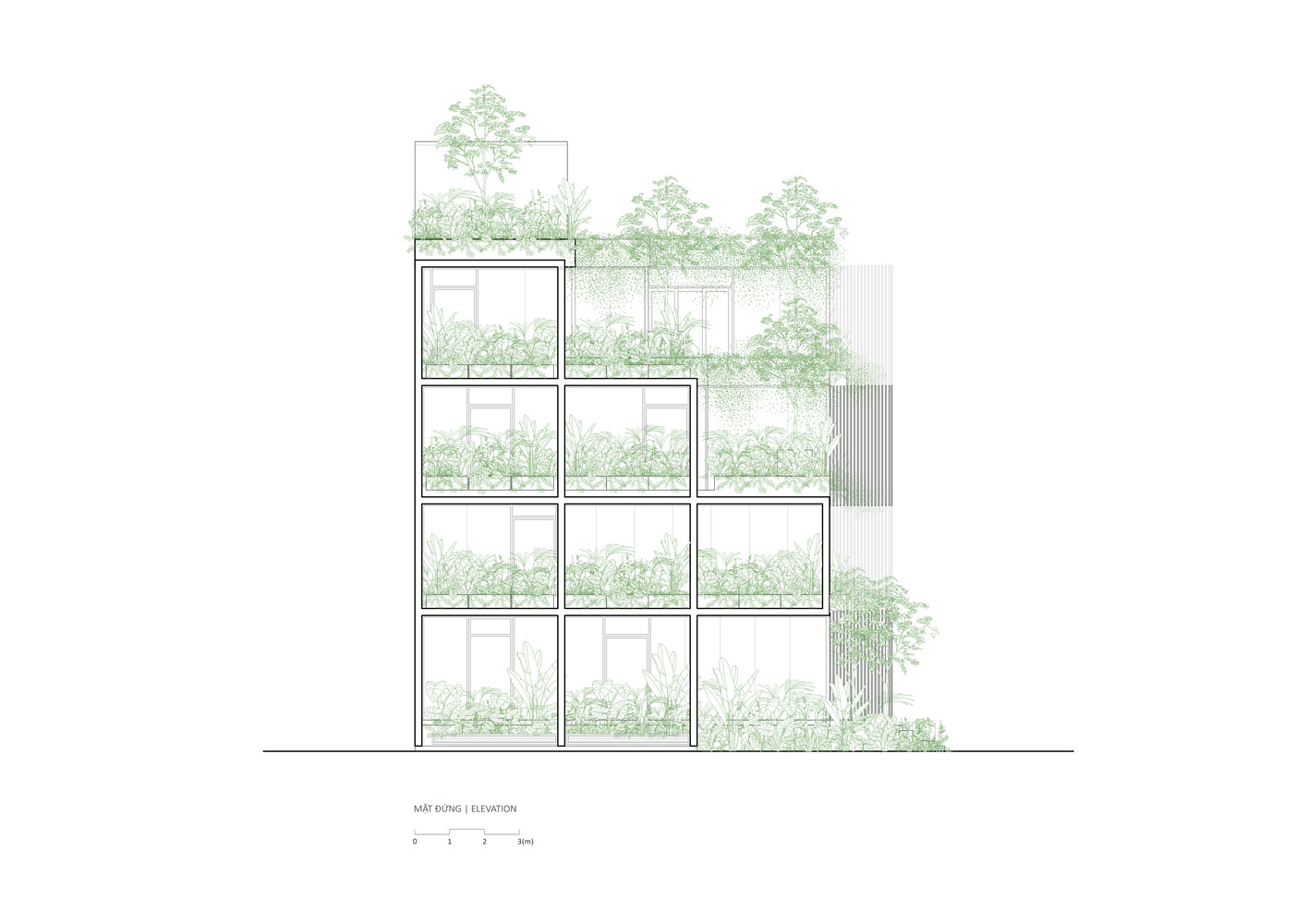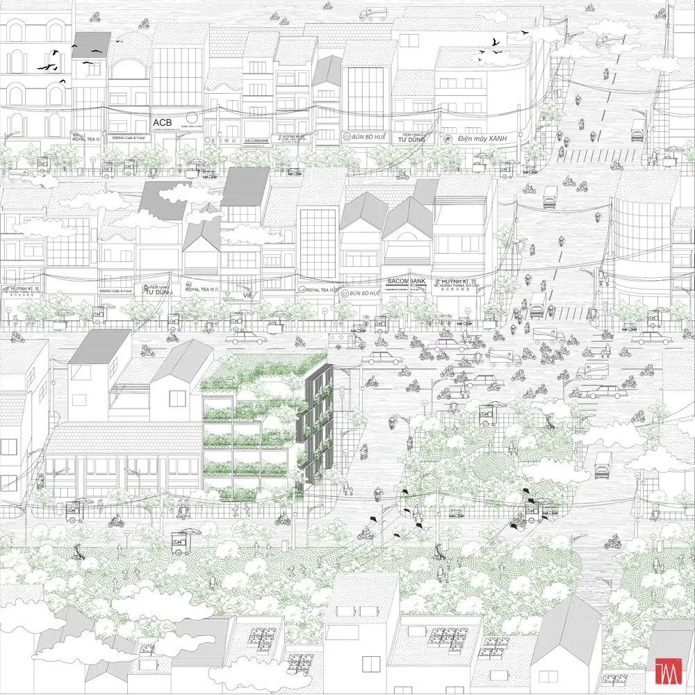 Ý tưởng sử dụng hình học đục lỗ cho phép tạo ra không gian trung gian để che nắng trong khi vẫn duy trì tầm nhìn rộng mở từ bên trong công trình ra cảnh quan đô thị bên ngoài. Mặt khác, việc lùi các kết cấu cứng tạo ra không gian cho cây xanh ngoài trời, tạo nên một lớp vỏ tự nhiên bao phủ các mặt tiền tiếp xúc với ánh sáng ban ngày.