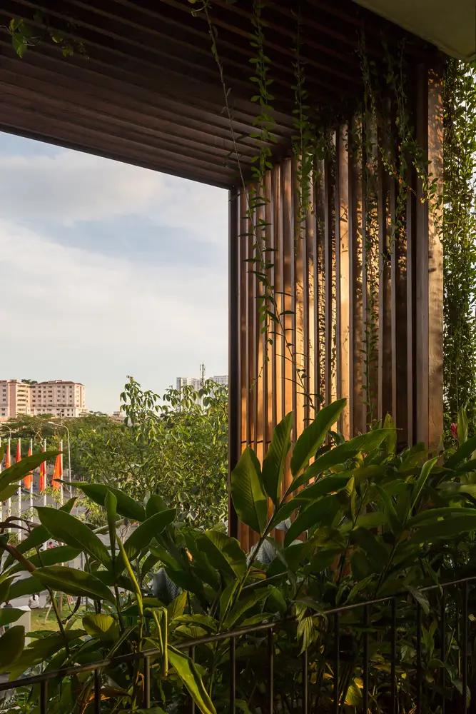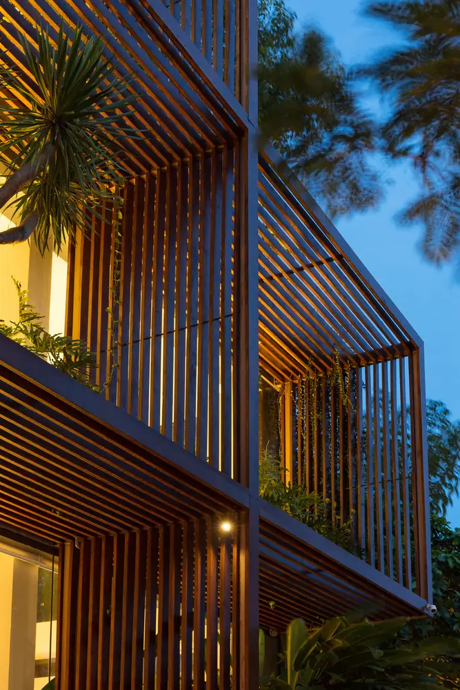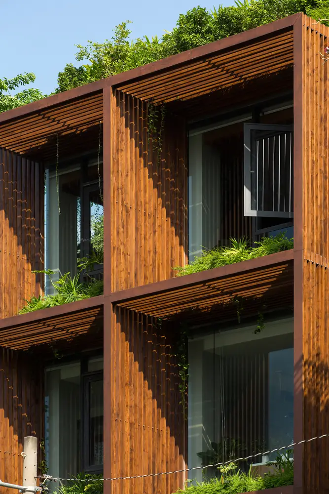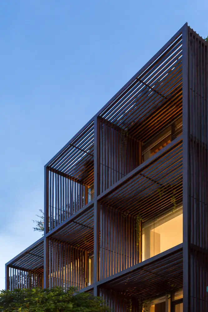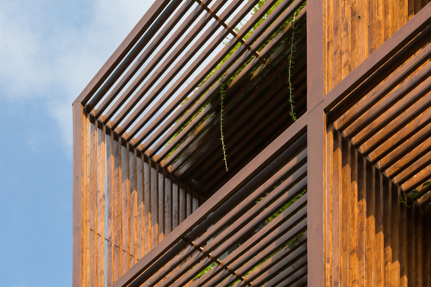 Một tập hợp các thanh gỗ tạo thành hình khối lập phương để che chắn hiệu quả ánh sáng ban ngày chiếu xiên vào tòa nhà. Đồng thời, phần kính thụt vào nhận được lượng ánh sáng phản chiếu tối đa, giúp tiết kiệm chi phí làm mát và chiếu sáng trong quá trình bảo trì tòa nhà.