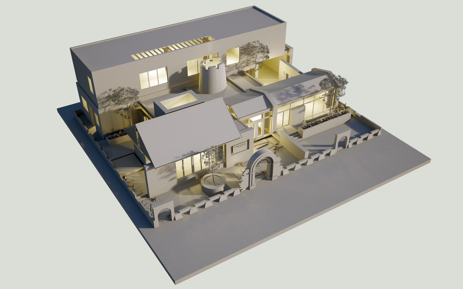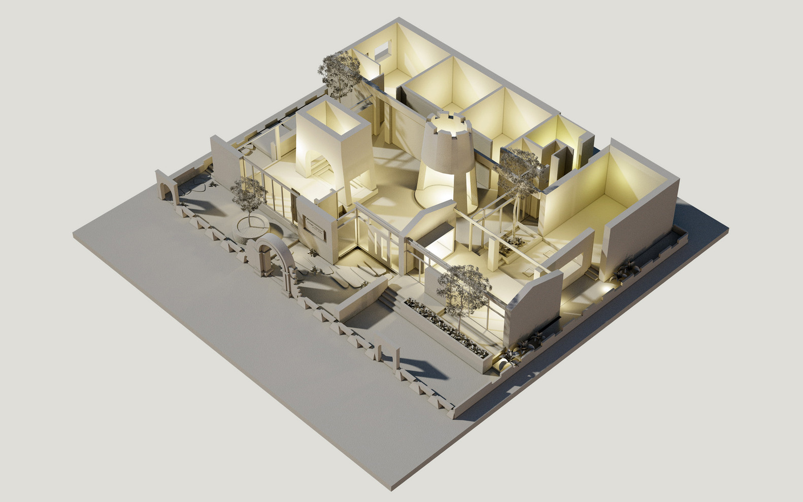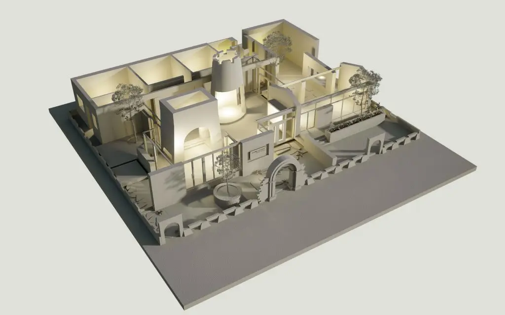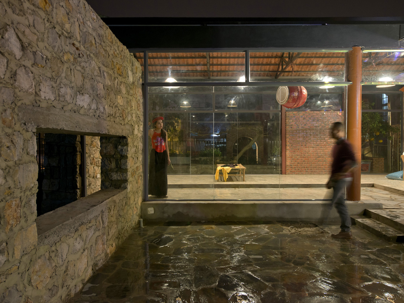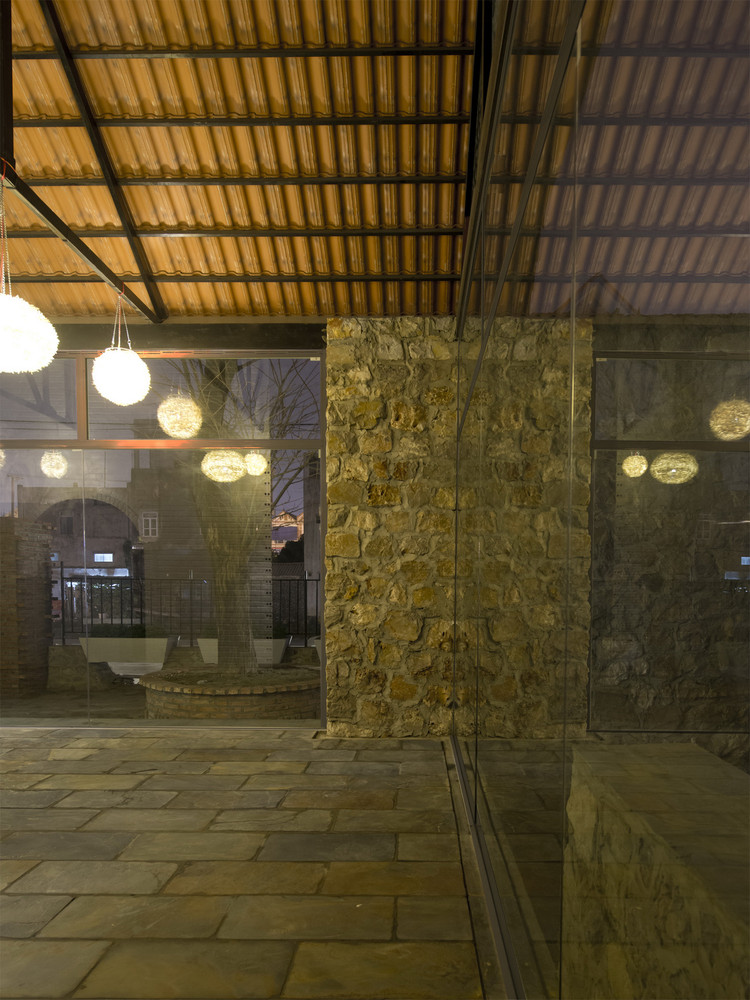 Công trình được tạo nên từ một loạt các bức tường đá (đá được lấy từ khu vực địa phương, do người dân địa phương xây dựng theo phương pháp truyền thống). Những bức tường dày 70 cm được kết hợp để tạo ra những không gian kiến trúc tương phản: Kín – Mở, Bên trong – Bên ngoài, Cũ – Mới, Mềm mại – Thô ráp.
