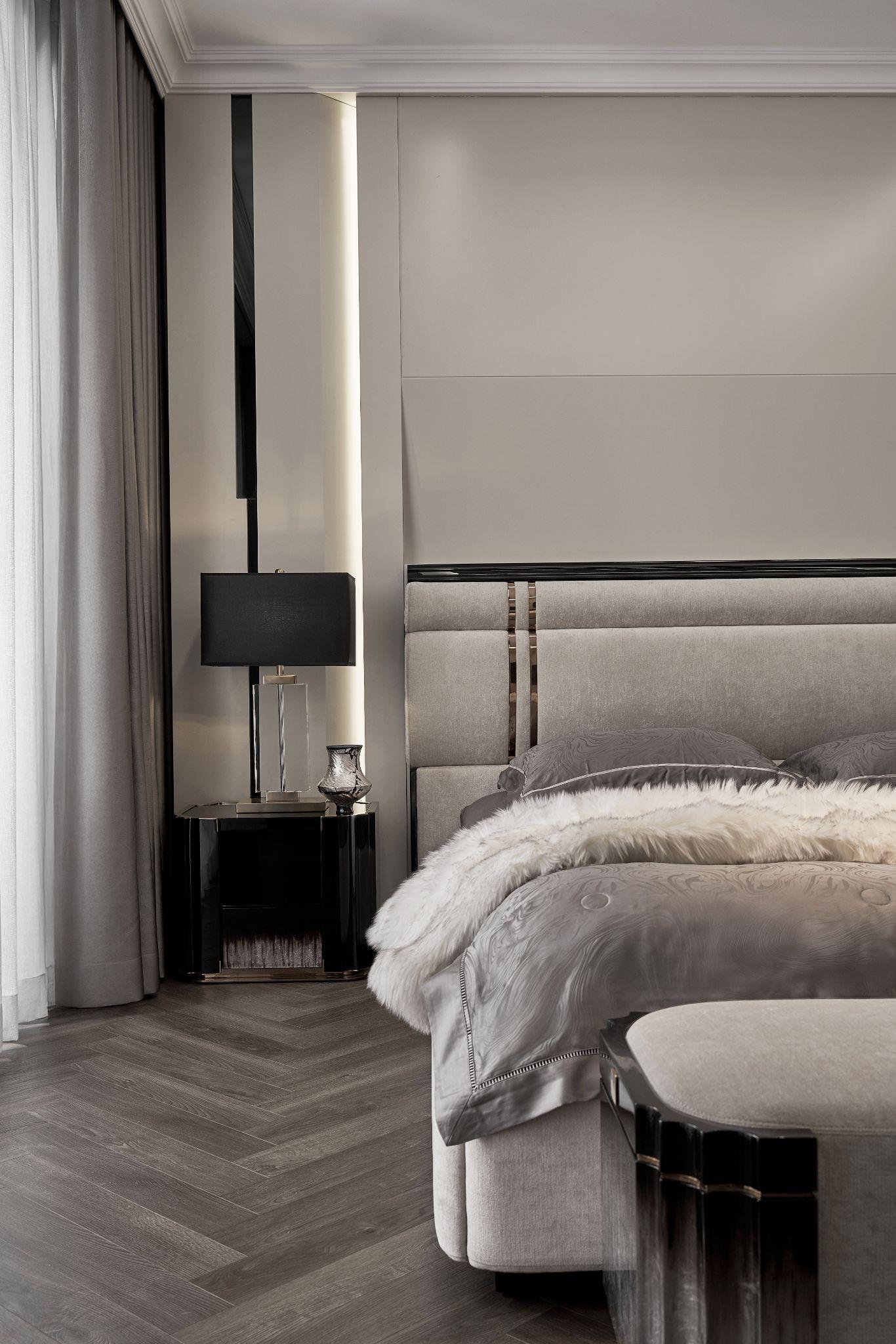 Phòng ngủ master sử dụng tone xám làm chủ đạo, phối cùng các điểm nhấn đồng ánh vàng