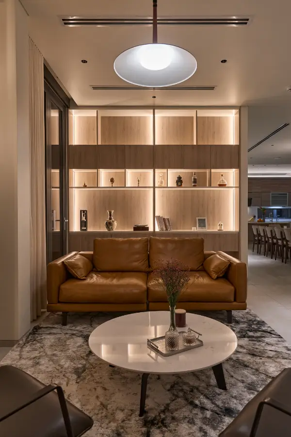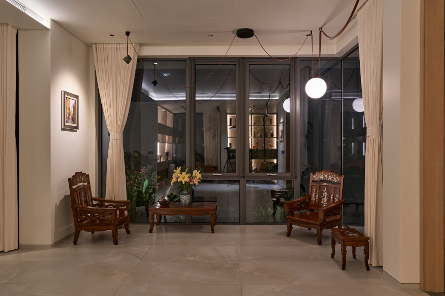 Trong quá trình thiết kế và lên ý tưởng, các thành viên trong gia đình đã có một cuộc tranh cãi về việc có nên giữ lại bộ bàn ghế gỗ cùng những đồ kỷ niệm khác ở nhà cũ hay không? Bởi theo concept hiện tại, nhà mới hướng tới sự sang trọng và hiện đại, bộ bàn ghế này sẽ không còn phù hợp. KTS đã xem xét nhu cầu và giải quyết bài toán này. Đầu tiên là bộ bàn ghế cũ được bày trí thành một không gian thưởng trà ngắm cảnh đối diện bàn tiếp khách, tiếp đến các vật dụng cũ như bàn và kệ tủ được đưa vào phòng ngủ của gia chủ nhằm đảm bảo tính quen thuộc mà không ảnh hưởng đến thẩm mỹ chung của ngôi nhà. Một số vật dụng kỷ niệm khác nhỏ hơn thì được trưng bày trên hệ tủ gỗ có hộp đèn led trang trọng vừa gợi nhắc những ký ức đẹp vừa thể hiện sự trân quý mỗi giai đoạn trong cuộc sống của gia chủ.