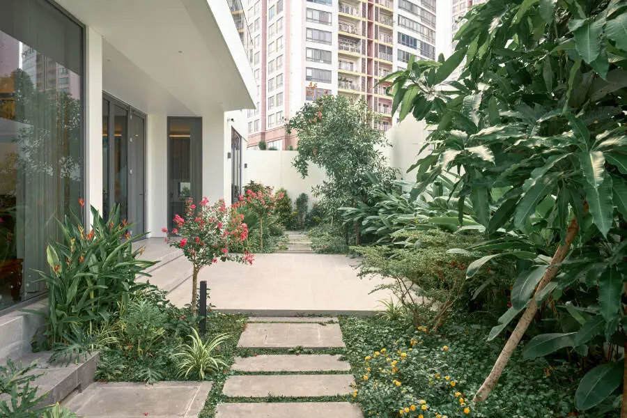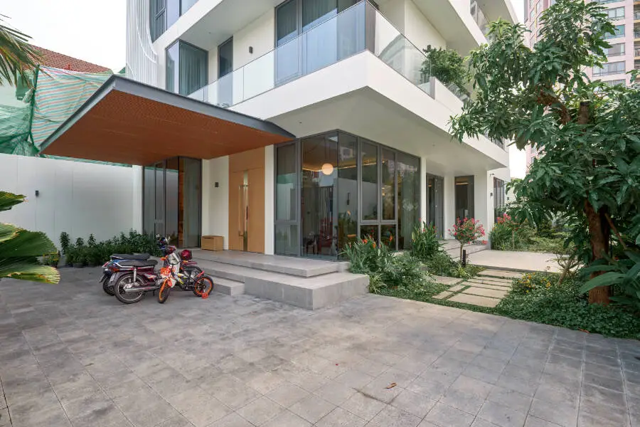 Mọi không gian đều được ưu tiên view ra mảng xanh bên ngoài giúp sinh hoạt hàng ngày trở nên thoải mái và tràn đầy sức sống. Đây cũng là tinh thần thiết kế nên nội thất của ngôi nhà mà các thành viên đều có cảm giác thư giãn “như đang ở resort 5 sao”. Mảng xanh cũng được bố trí xung quanh khuôn viên, từ bàn ăn cơm và góc thưởng trà có thể nhìn ngắm cây cối lay động bởi làn gió mát và hướng mặt trời thay đổi trong ngày, giúp cho ngôi nhà như đang vận động thực sự.