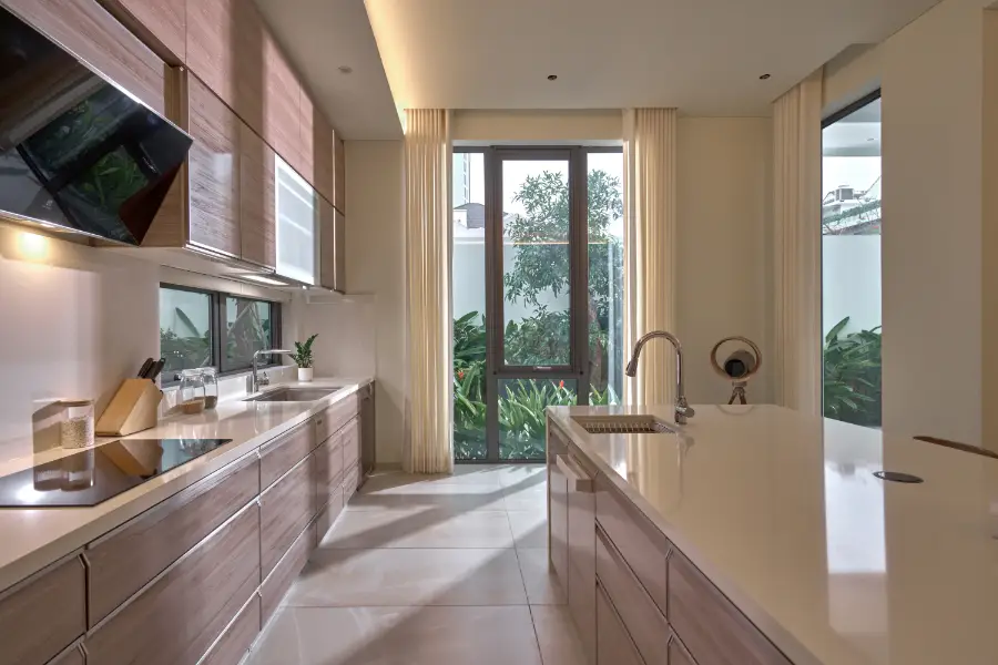 Bên cạnh “thủ thuật mượn cảnh”, các bậc cầu thang và góc vuông cột trong nhà đều được vát cạnh tinh tế. Điều này nhằm tạo sự êm ái cho đôi chân người sử dụng khi bước đi, nhất là đối với những người cao tuổi. Thiết kế bếp chính – phụ cũng được cân nhắc để hạn chế tối đa mùi thực phẩm trong không gian chung. Cụ thể, bếp phụ là nơi nấu những bữa ăn chính trong ngày thì được bố trí nối liền sân sau và được ngăn cách với toàn bộ không gian tầng trệt thông qua 1 cánh cửa. Kế đến là bếp chính – nơi được dùng để làm bánh và chế biến các món ăn nhẹ, thức uống cho gia đình thì được bố trí nối liền bàn ăn như một sự cộng hưởng cho vẻ đẹp tinh tế của nội thất tầng trệt.