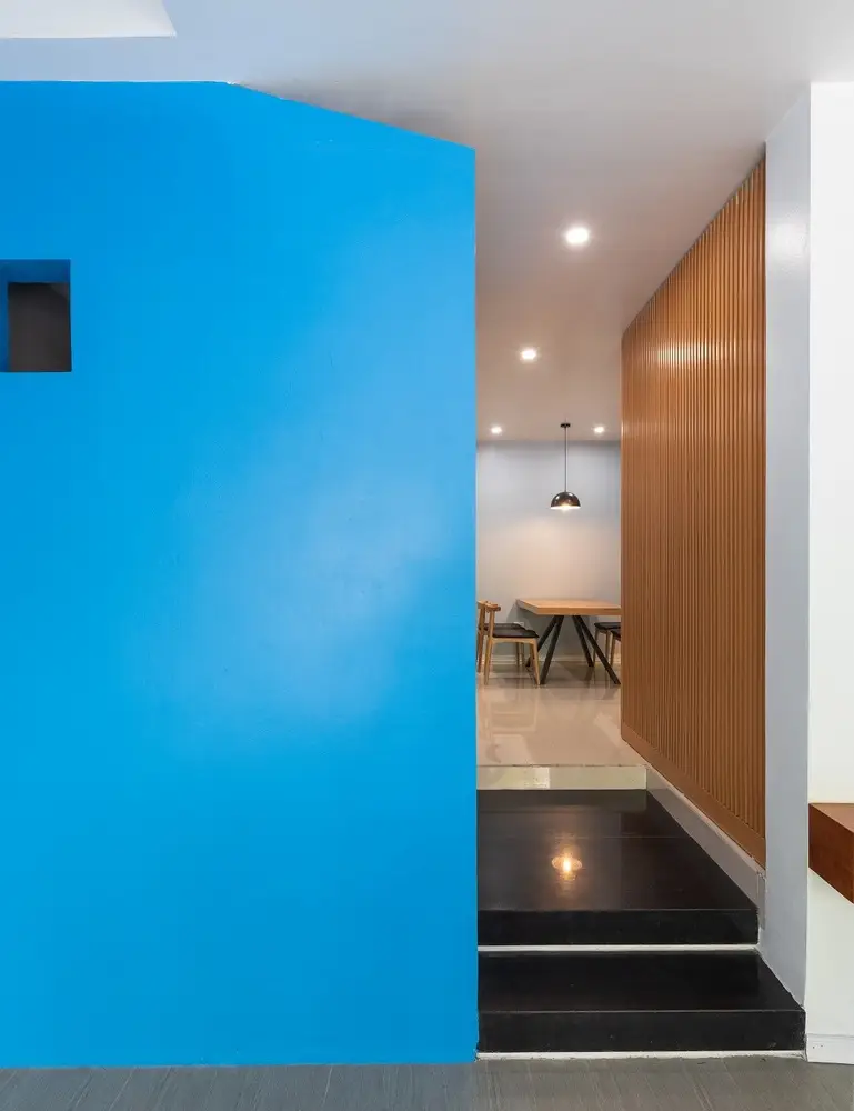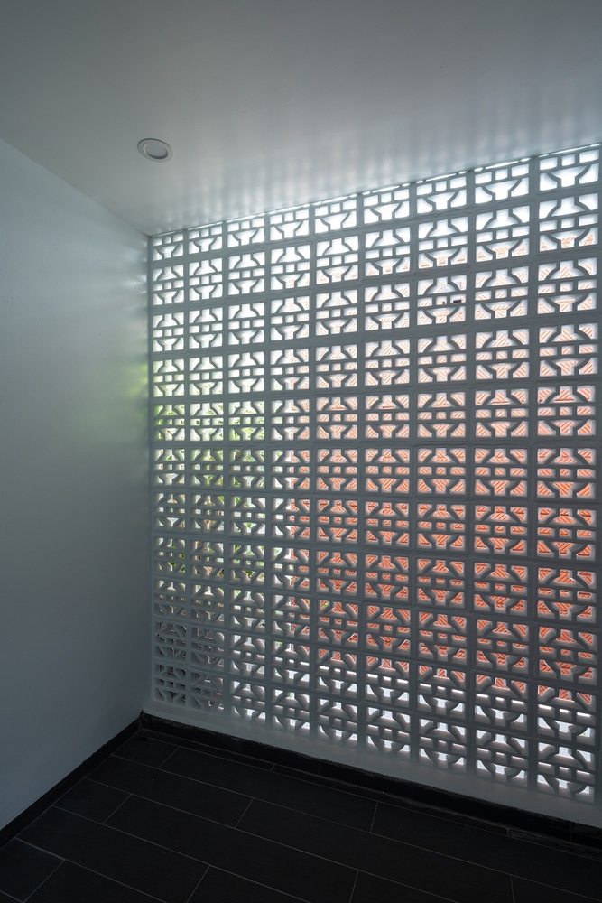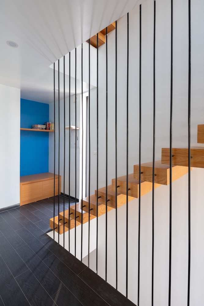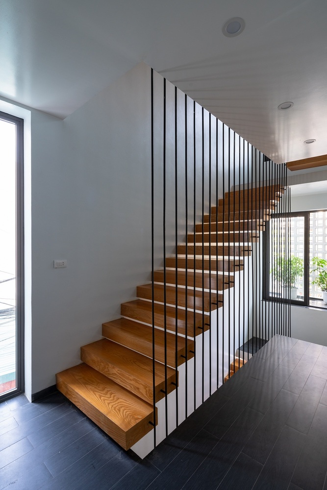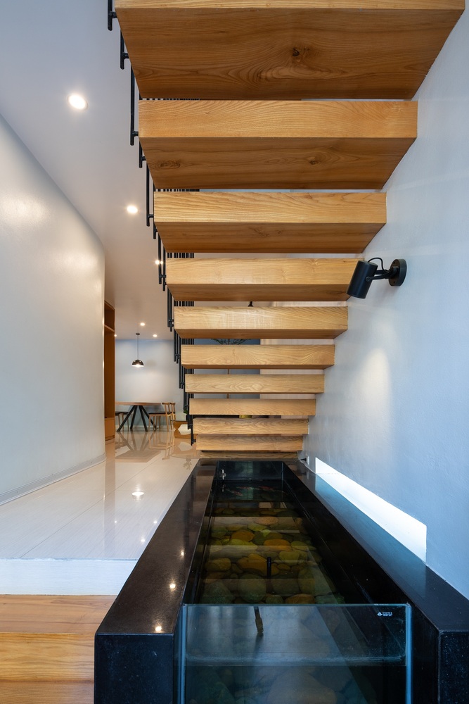 Vấn đề đối với nhà thiết kế là làm thế nào để di chuyển lên xuống mà không bị mệt mỏi và nhàm chán. Giải pháp đưa cầu thang ra phía trước nhà, tận dụng ánh sáng từ mặt tiền, là một điểm cộng của ngôi nhà thác nước. Cầu thang được thiết kế mở, cho phép ánh sáng lan tỏa khắp không gian. Với thiết kế này, thiên nhiên được đưa vào trong nhà, những tia nắng nhảy múa theo nhịp điệu của từng khoảnh khắc. Không gian thay đổi theo giờ, mỗi ngày, mỗi mùa trong năm.