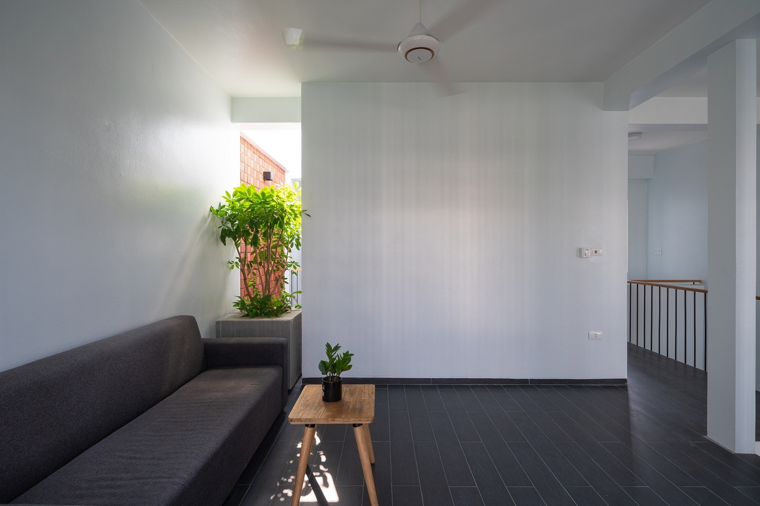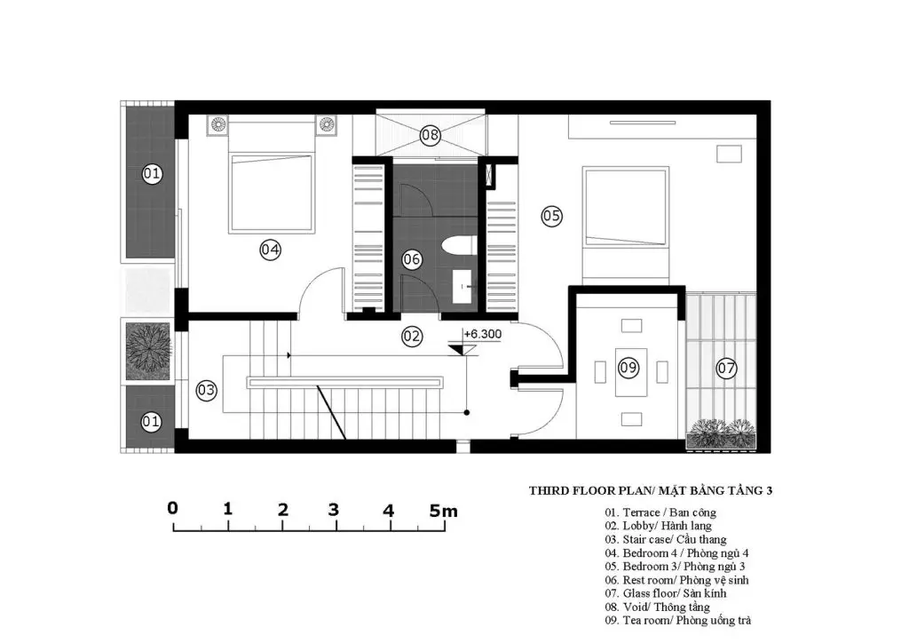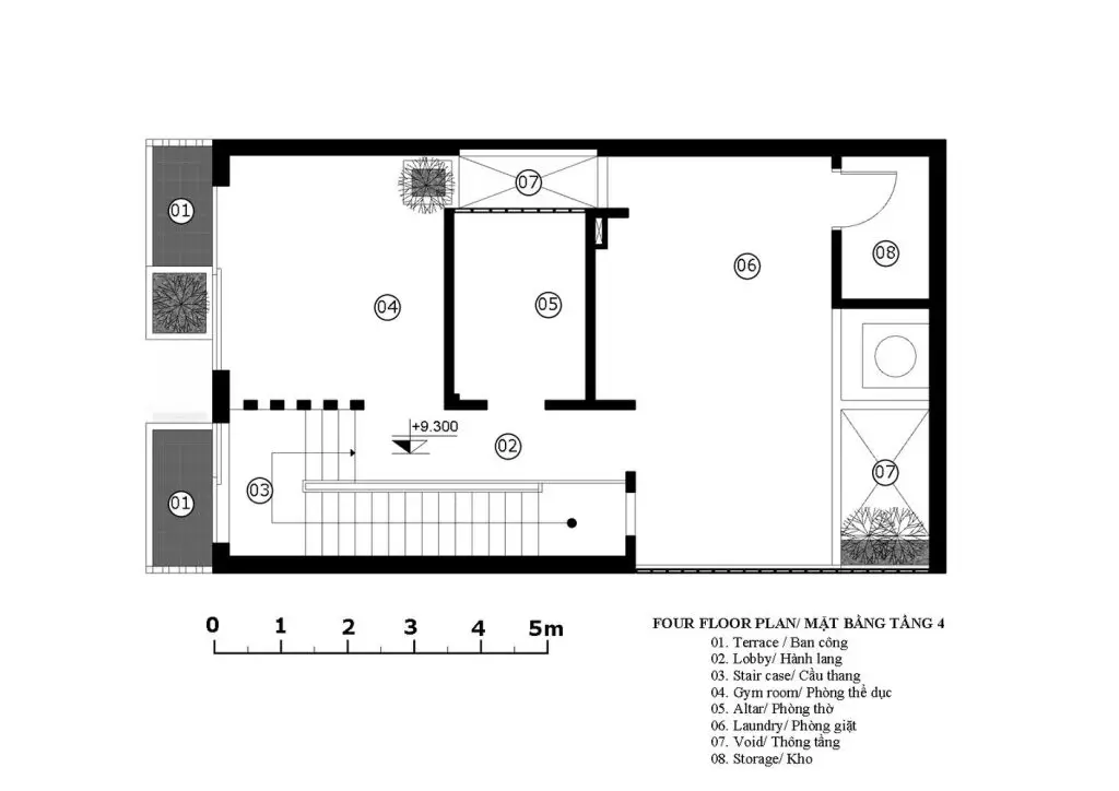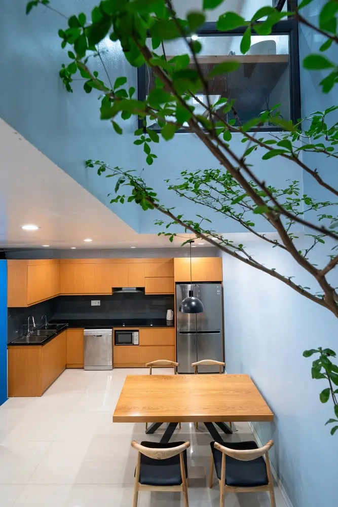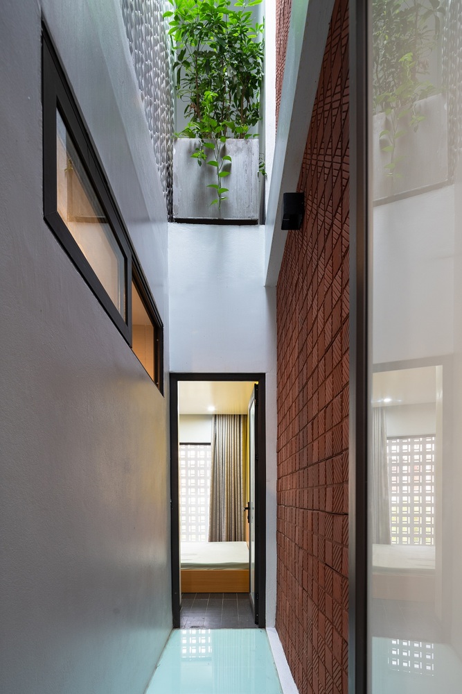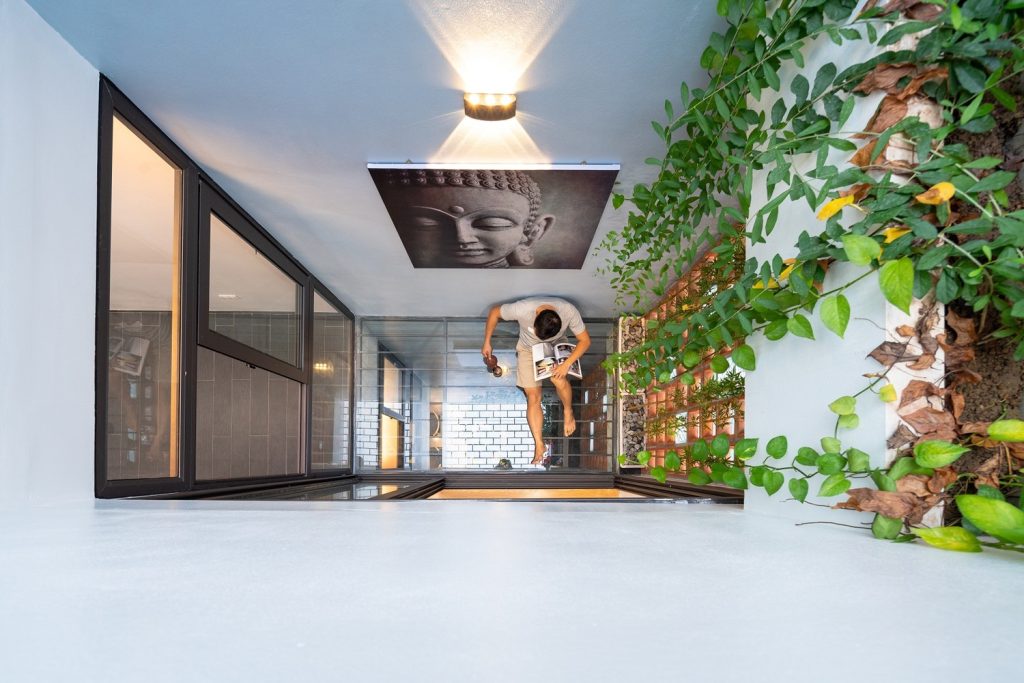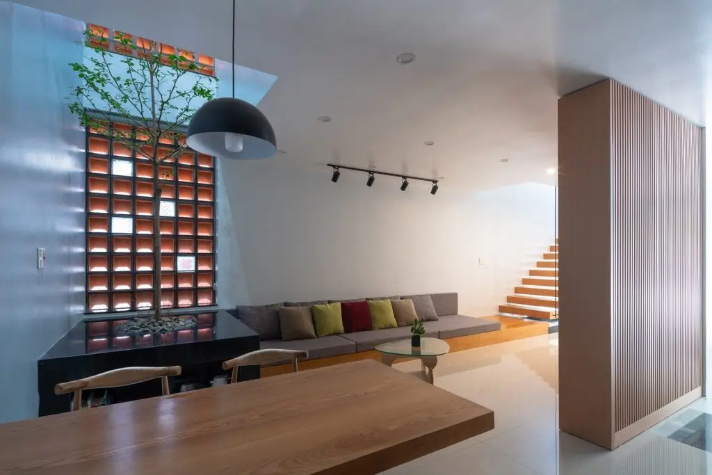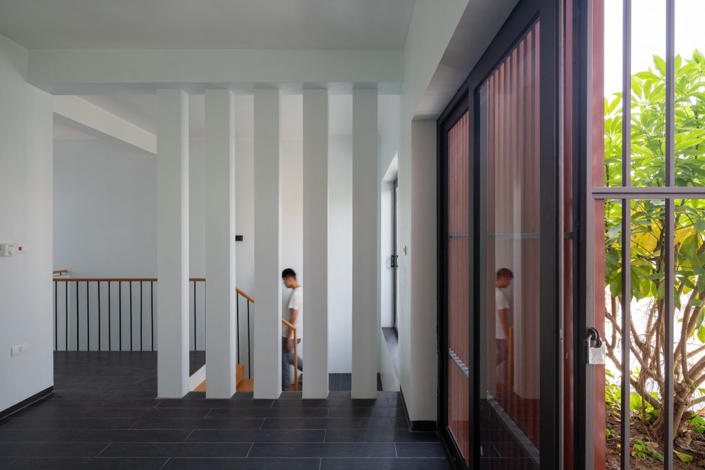Nhà thiết kế phải cân bằng giữa mong muốn của chủ nhà, các tiện ích sử dụng và các tiêu chí đã cho: tất cả các không gian phải được đón ánh sáng tự nhiên và thông gió. Bản thiết kế đề ra là mở các giếng trời theo hàng chục hướng thẳng đứng để tạo không gian xanh cho các phòng chức năng xung quanh. Tầng trệt gồm gara, phòng khách, bếp và phòng ăn. Không gian nội thất đơn giản và tinh tế, không phô trương. Điểm nhấn chính của không gian tầng một là những hàng cây dưới bầu trời. Một điểm nhấn quý giá, đặc biệt trong bối cảnh thị trấn nhỏ hẹp. Cầu thang là không gian kết nối các tầng của ngôi nhà, không được bố trí ở giữa nhà như những thiết kế thường thấy ở nhà phố. Trong bối cảnh chật hẹp, một ngôi nhà phố với diện tích nhỏ được thiết kế nhiều tầng.