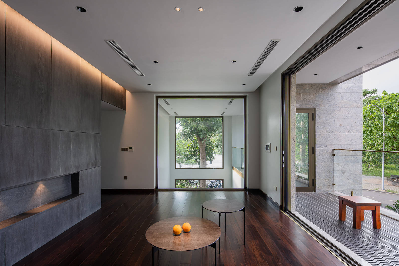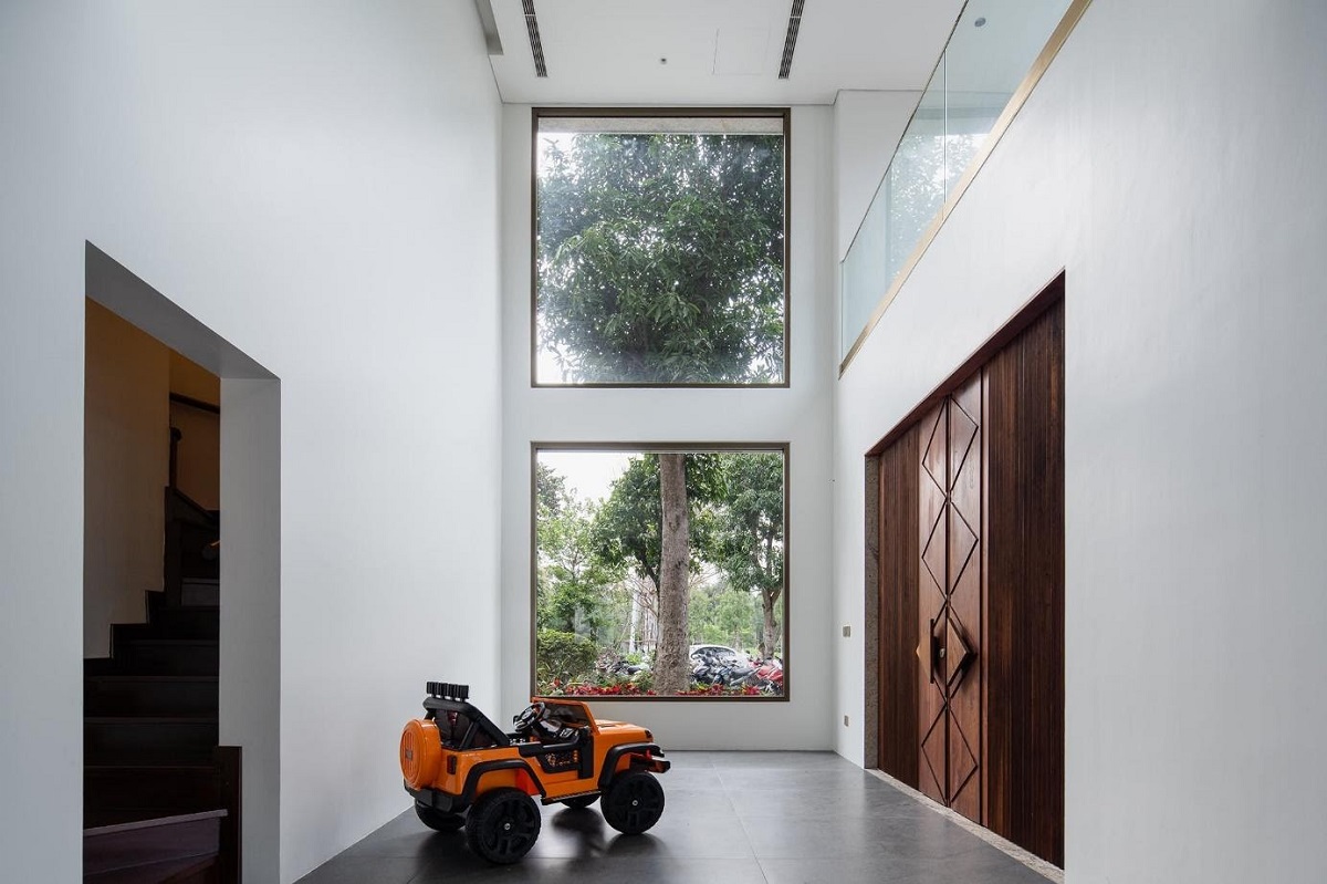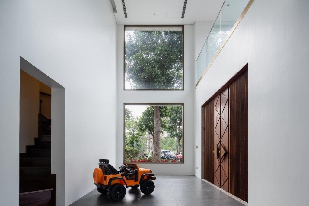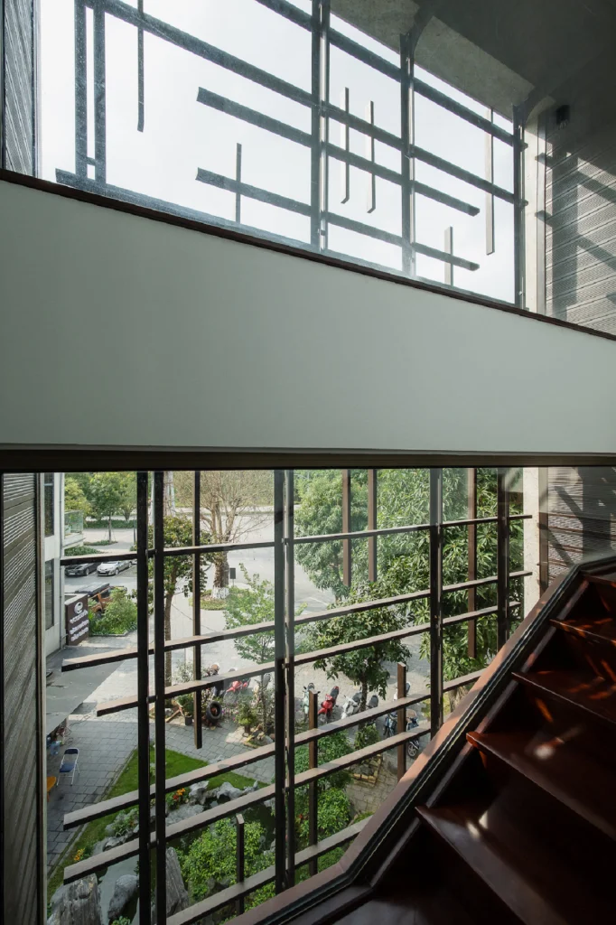 Tất cả các không gian công năng trong nhà được thiết kế đều có sự liên hệ với bên ngoài theo các điểm nhìn thú vị nhất. Chúng tôi tổ chức các điểm nhìn này không chỉ theo cách định hướng ra bên ngoài mà đồng thời đóng khung chúng với các kích thước và cấu tạo ô mở đa dạng. Điều này tạo thêm kịch tính cho mối liên hệ “trong – ngoài”, tăng thêm trải nghiệm phong phú cho người sử dụng.