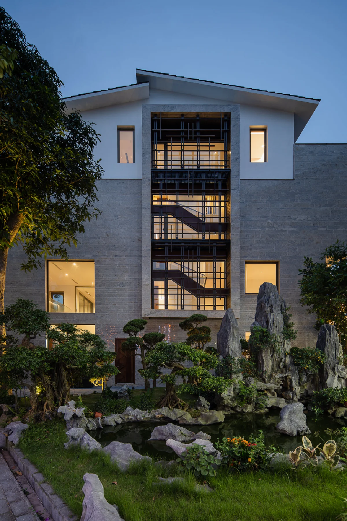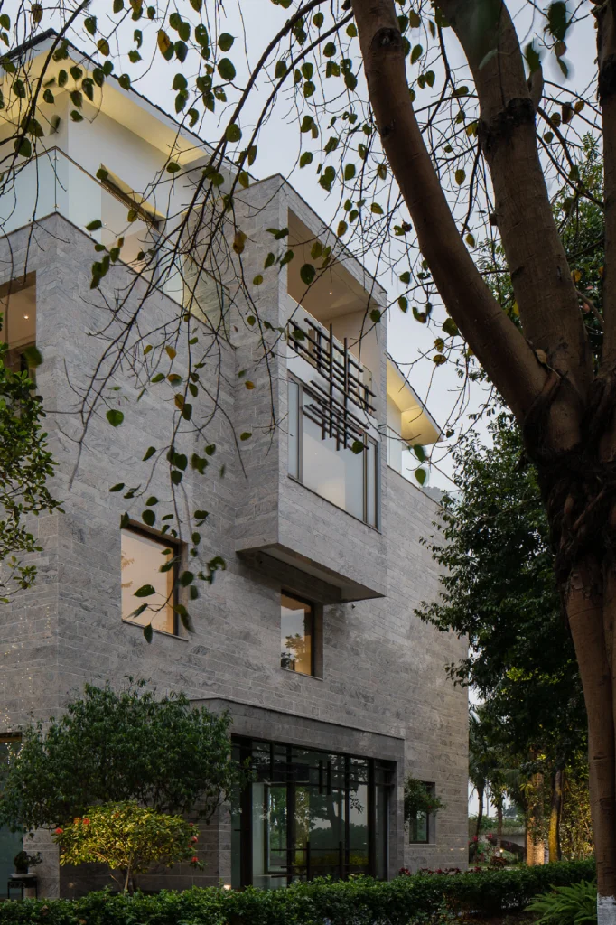 Một số các ô mở được chúng tôi tạo ra chứa đựng cả những công năng trong đó. Chính hình khối của các không gian này tác động trực tiếp lên mặt tiền. Chúng cấu trúc lại tổng thể hình khối ngôi nhà một cách mạch lạc hơn. Thêm vào đó, công trình được khoác lên mình một lớp áo mới bằng vật liệu đá tự nhiên. Sự tổ hợp của các tấm đá trên mặt ngoài của ngôi nhà cùng với tông màu và hoa văn của chúng tạo ra các cuộc đối thoại với cây cỏ thiên nhiên một cách thú vị tùy vào thời gian trong ngày, thời tiết trong năm. Ngôi nhà như một “vật thể” độc lập vừa có cá tính riêng, nhưng cũng vừa tương tác mật thiết với bối cảnh của khu vực.