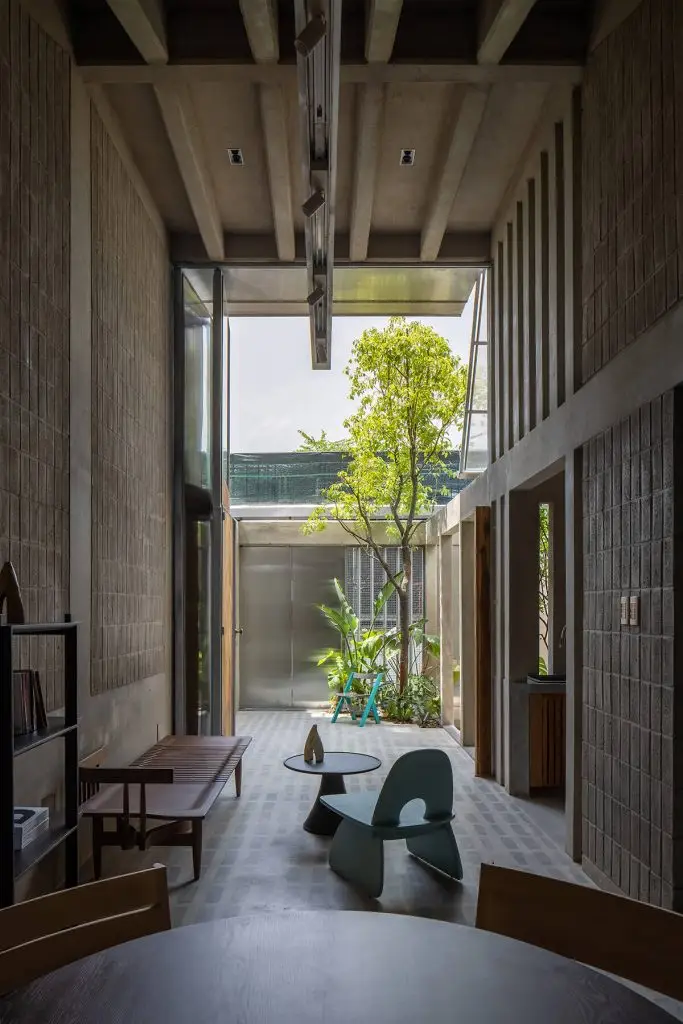 Về tổ chức không gian, toàn bộ các khu vực kỹ thuật và phục vụ như cầu thang, bếp, vệ sinh và kho được gom lại thành một lõi bê tông chạy dọc theo một bên nhà. Giải pháp này giúp giải phóng phần diện tích còn lại thành một không gian mở, linh hoạt, có thể thích ứng với nhiều hoạt động khác nhau: sinh hoạt gia đình, đọc sách, nghỉ ngơi hay tổ chức các buổi chiếu phim nghệ thuật quy mô nhỏ. Việc tập trung lõi kỹ thuật cũng góp phần làm mờ ranh giới giữa các tầng chức năng, tạo điều kiện cho ánh sáng và không khí lưu chuyển liên tục theo chiều đứng – một yếu tố đặc biệt quan trọng đối với nhà ở đô thị trong điều kiện khí hậu nóng ẩm.