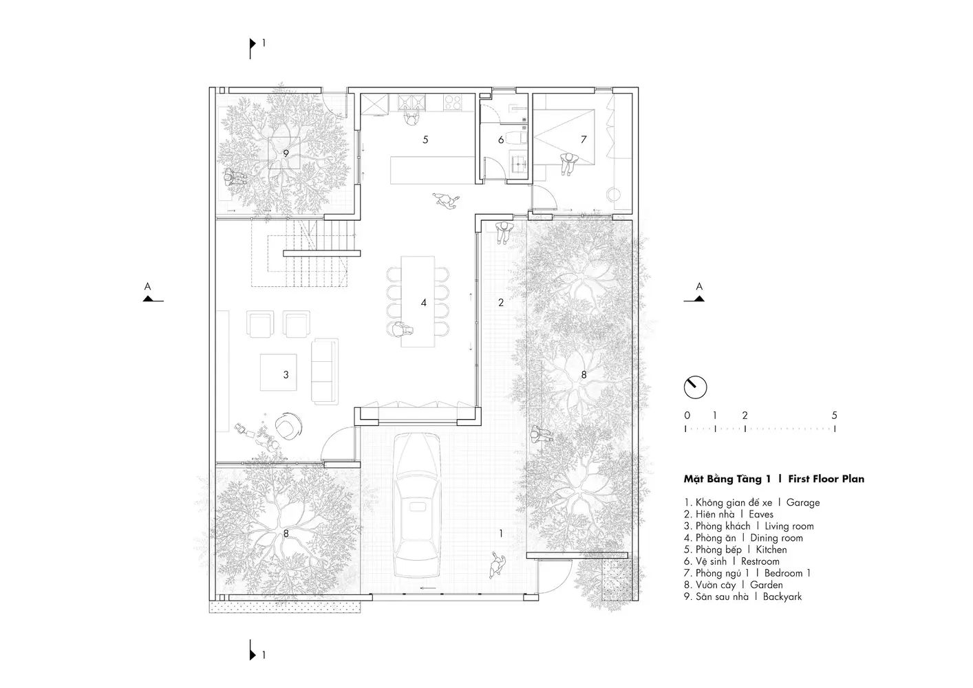 Phương án được lựa chọn là hai khối nhà chuyển dịch tạo thành những khu vườn xen kẽ với ngôi nhà, tạo sự cân bằng giữa thiên nhiên và kiến ​​trúc. Các không gian bên trong nhà luôn nhìn ra vườn, không có cảm giác như đang ở giữa nhà phố. Mặc dù ban đầu có những lo ngại về chất liệu và hình dáng của công trình nhưng sau khi hoàn thiện, các thành viên trong gia đình rất hài lòng với ngôi nhà và ít nhiều đã thay đổi thói quen sinh hoạt. Gia chủ trở nên yêu thích cây cỏ, yêu thích việc chăm sóc ngôi nhà và nhìn thấy vẻ đẹp giản dị, mộc mạc của bê tông, không gian và ánh sáng.