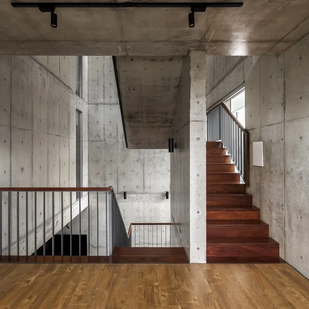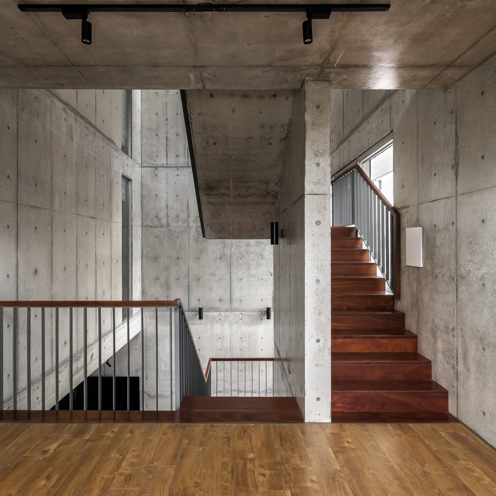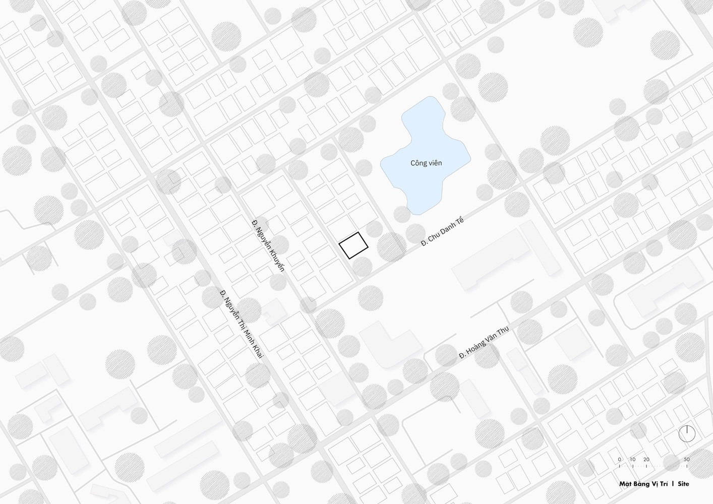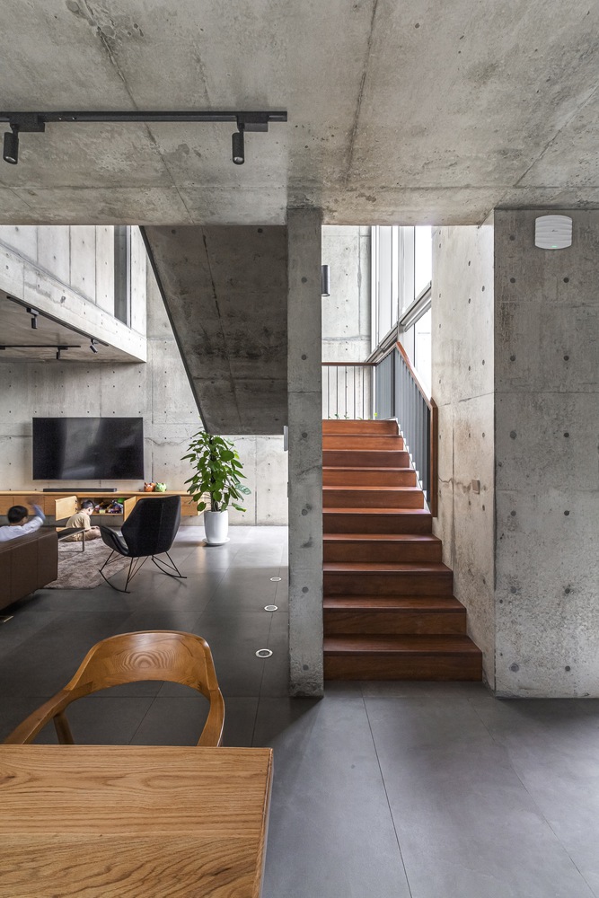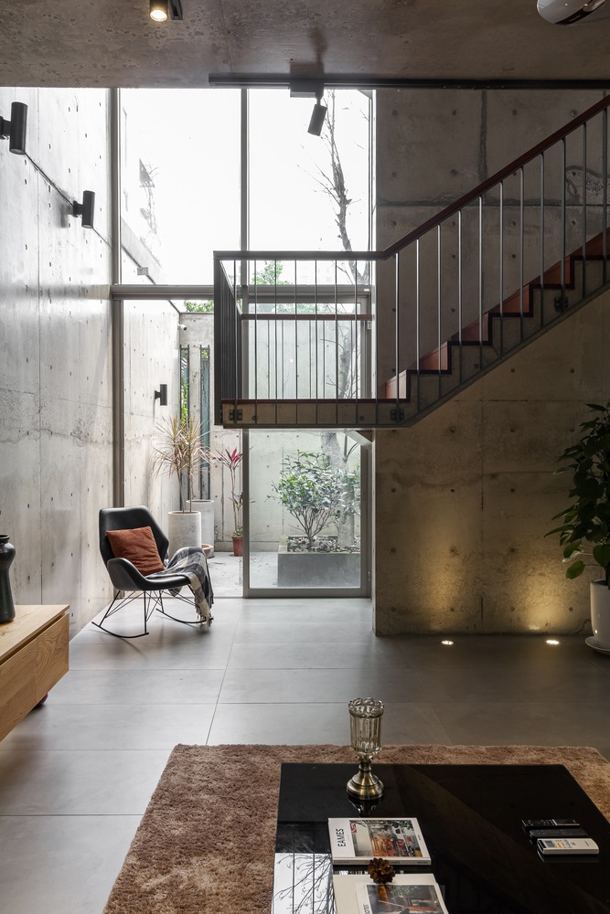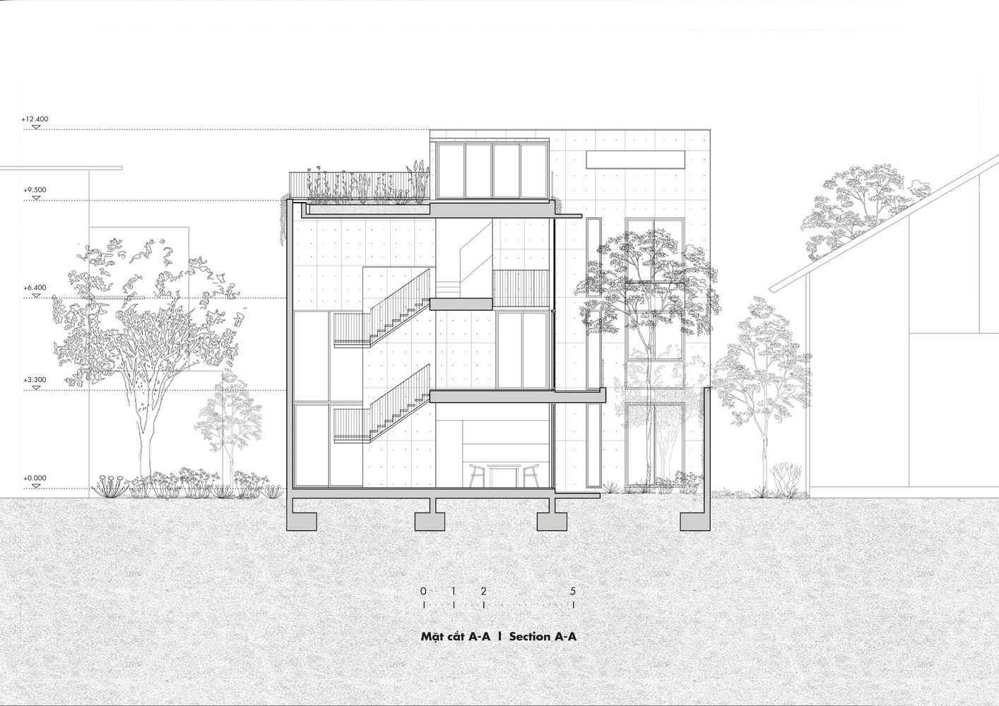 Đây là một dự án khá đặc biệt khi chúng tôi thử nghiệm một kết cấu hoàn toàn bằng bê tông. Công trình nằm trong khu đô thị, diện tích đất 14×17 m, mật độ xây dựng 50%. Cách tiếp cận dự án này cũng tương tự như các dự án khác của văn phòng, chúng tôi mong muốn tìm ra giải pháp đơn giản, bền vững cho các dự án nhà ở tại Việt Nam, đồng thời tìm ra sự cân bằng giữa kiến ​​trúc. và thiên nhiên. Chúng tôi muốn khu vườn không phải là một yếu tố trang trí mà trở thành một phần không thể thiếu của ngôi nhà và phát triển cùng với ngôi nhà. Đồng thời, với việc lựa chọn vật liệu bê tông, mọi quyết định đều được cân nhắc kỹ lưỡng để đảm bảo ngôi nhà có thể sử dụng lâu dài mà không cần phải sửa chữa, thay mới.