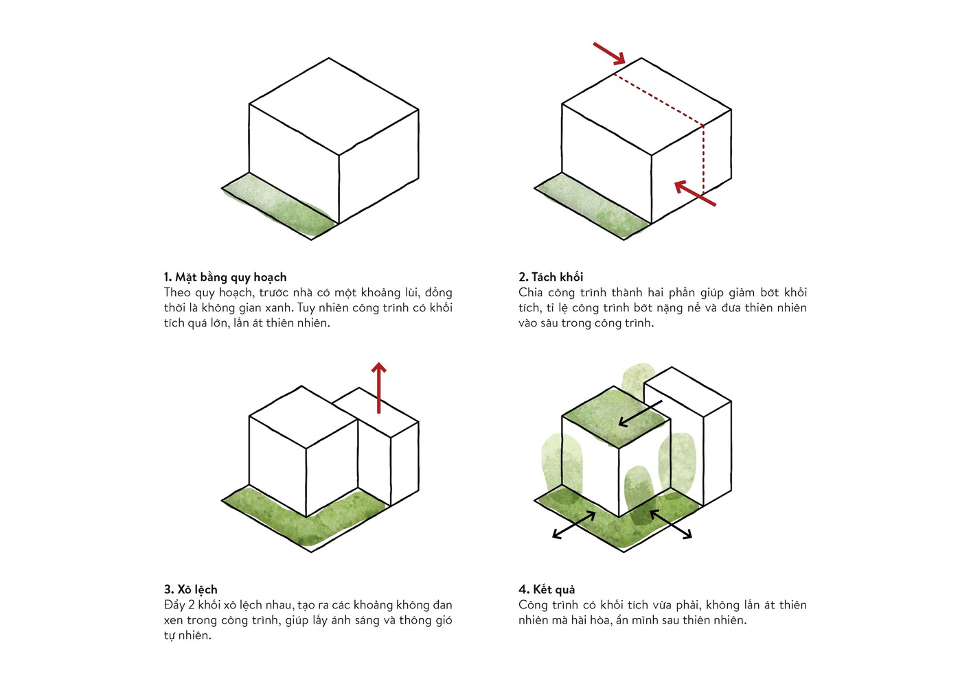 Phương án được lựa chọn là hai khối nhà chuyển dịch tạo thành những khu vườn xen kẽ với ngôi nhà, tạo sự cân bằng giữa thiên nhiên và kiến ​​trúc. Các không gian bên trong nhà luôn nhìn ra vườn, không có cảm giác như đang ở giữa nhà phố. Mặc dù ban đầu có những lo ngại về chất liệu và hình dáng của công trình nhưng sau khi hoàn thiện, các thành viên trong gia đình rất hài lòng với ngôi nhà và ít nhiều đã thay đổi thói quen sinh hoạt. Gia chủ trở nên yêu thích cây cỏ, yêu thích việc chăm sóc ngôi nhà và nhìn thấy vẻ đẹp giản dị, mộc mạc của bê tông, không gian và ánh sáng.