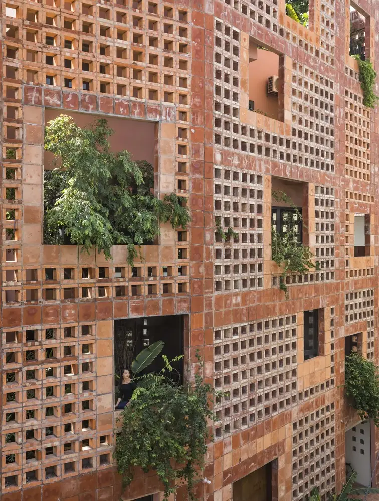 Trong bối cảnh giàu văn hóa của ngôi làng, nhóm thiết kế ưu tiên sử dụng vật liệu địa phương. Ngoài ra, chủ sở hữu là một chuyên gia về gốm sứ nên VTN Architects đã có thể tận dụng được chất liệu này. Gốm có tính thẩm mỹ thô và độ bền cao, phù hợp với lớp vỏ bên ngoài của công trình. Toàn bộ mặt tiền của thiết kế được làm hoàn toàn bằng gạch men. Những viên gạch được làm riêng theo kích thước để tạo ra nhịp điệu xen kẽ, mở ra ở một số không gian trong khi đóng lại ở những không gian khác. Những khoảng trống nhỏ được tạo ra bởi việc đặt gạch đóng vai trò là lỗ thông hơi, lưu thông không khí khắp tòa nhà. Trong khi đó, những khoảng mở lớn của mặt tiền lại có nhiều cây xanh, cho phép ánh sáng được lọc xuyên qua.