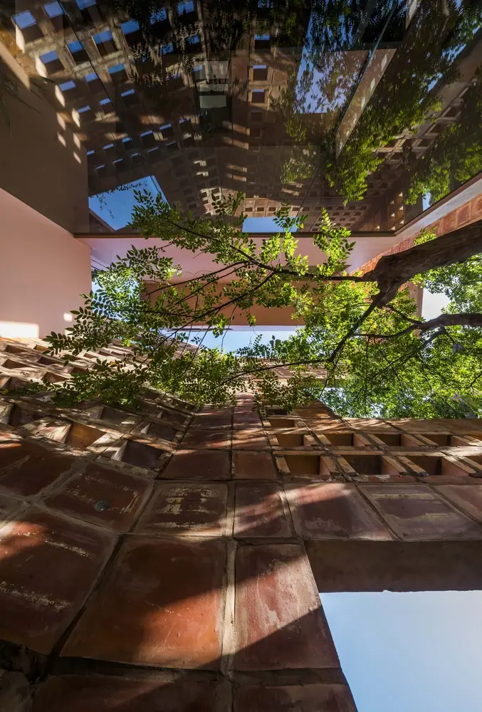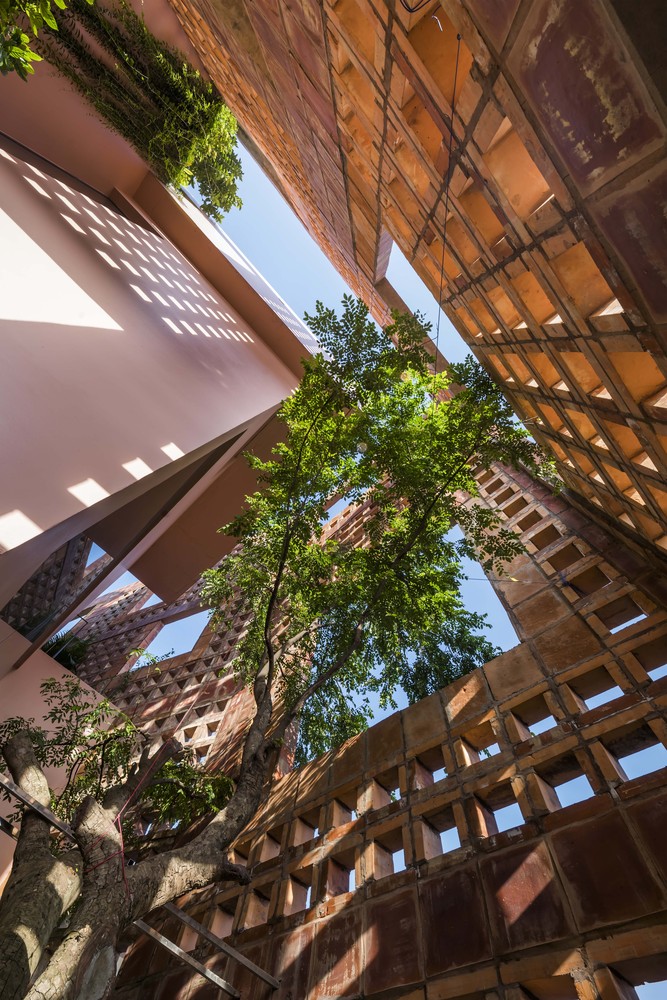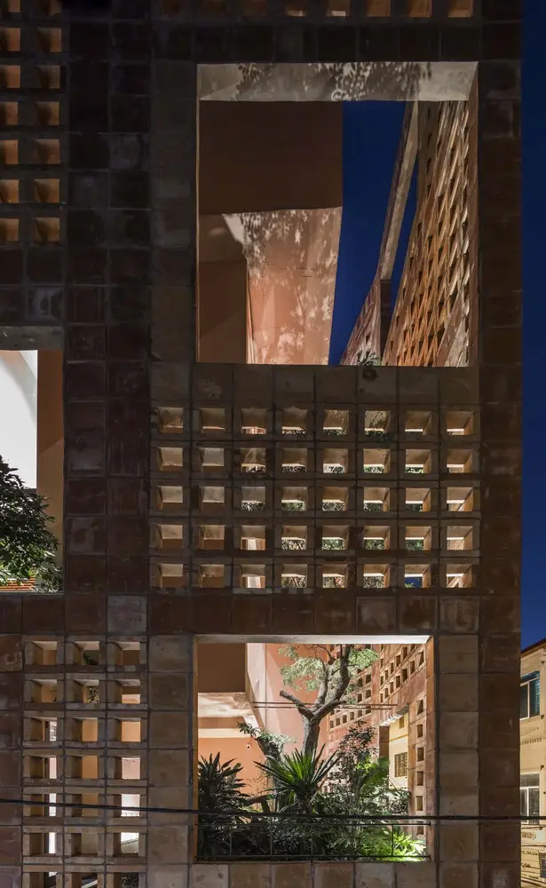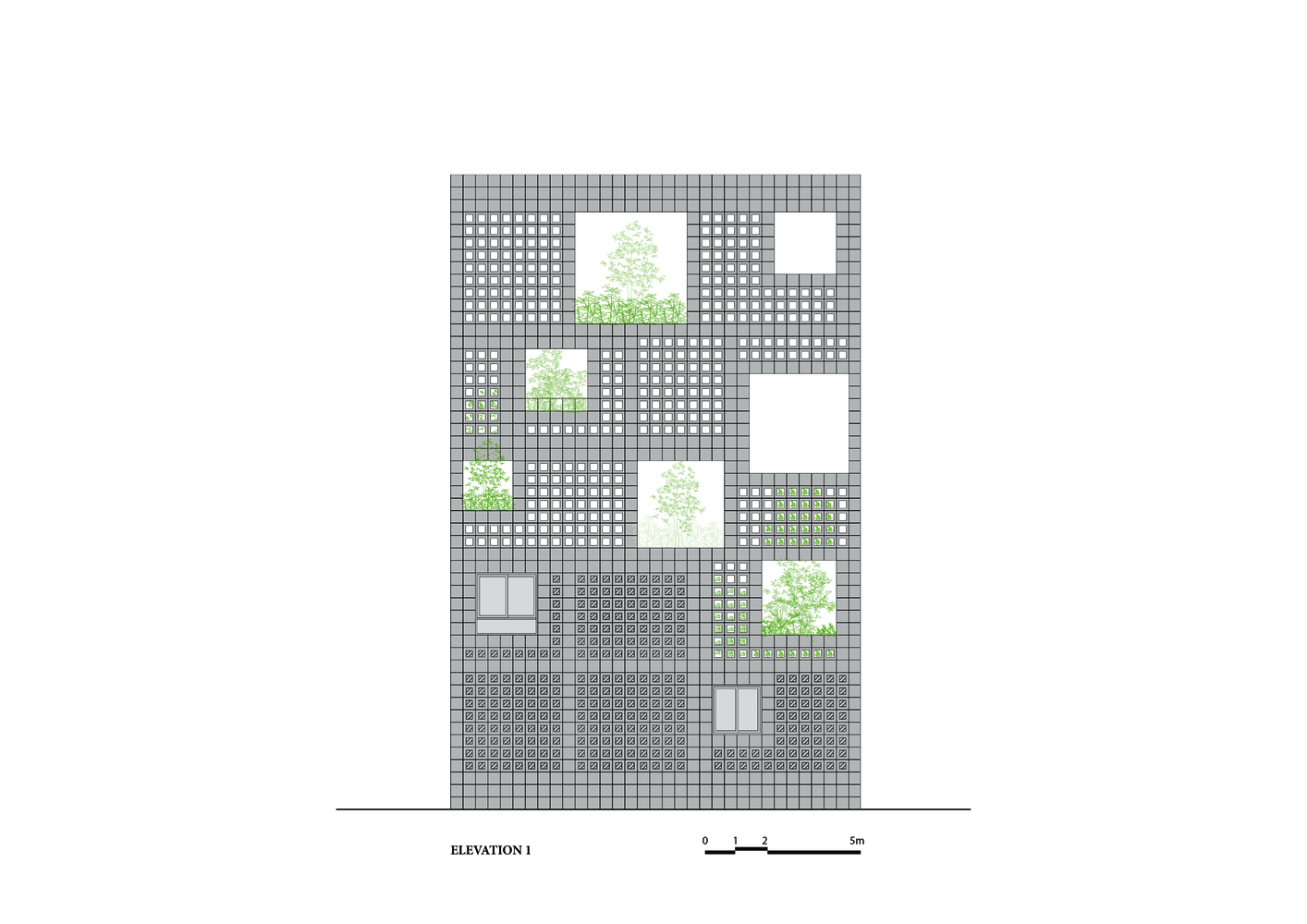 Trong bối cảnh giàu văn hóa của ngôi làng, nhóm thiết kế ưu tiên sử dụng vật liệu địa phương. Ngoài ra, chủ sở hữu là một chuyên gia về gốm sứ nên VTN Architects đã có thể tận dụng được chất liệu này. Gốm có tính thẩm mỹ thô và độ bền cao, phù hợp với lớp vỏ bên ngoài của công trình. Toàn bộ mặt tiền của thiết kế được làm hoàn toàn bằng gạch men. Những viên gạch được làm riêng theo kích thước để tạo ra nhịp điệu xen kẽ, mở ra ở một số không gian trong khi đóng lại ở những không gian khác. Những khoảng trống nhỏ được tạo ra bởi việc đặt gạch đóng vai trò là lỗ thông hơi, lưu thông không khí khắp tòa nhà. Trong khi đó, những khoảng mở lớn của mặt tiền lại có nhiều cây xanh, cho phép ánh sáng được lọc xuyên qua.