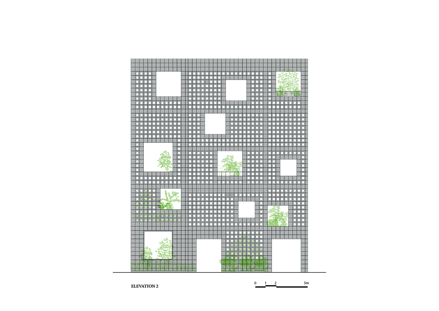 Không gian nội thất được thiết kế theo phong cách tối giản. Các tấm kính lớn được tích hợp mà không sợ làm ngôi nhà quá nóng vì ánh sáng mặt trời trực tiếp được lọc bởi hai lớp mặt tiền gốm và mặt tiền cây xanh. Các khoảng trống của các bức tường gốm hoạt động đặc biệt tốt trong việc thu được lượng năng lượng mặt trời phù hợp cho nội thất một cách hiệu quả, đặc biệt là vào mùa hè. Việc sử dụng điều hòa không khí nhân tạo là không cần thiết vì hệ thống thông gió ba lớp “mặt tiền bằng gốm bên ngoài”, “không gian xanh xen kẽ” và “cửa” đảm bảo ngôi nhà “tuyệt đối mát mẻ”. Các tấm pin mặt trời và bộ thu nước mưa cũng tham gia vào thiết kế bền vững. Những cửa sổ rộng lớn, những khoảng hở bằng gốm xen kẽ được kết nối bởi khu rừng trong nhà tạo nên một khung tranh sống động nhiều lớp luôn thay đổi cho người ở.