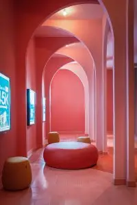 “Nhưng chúng tôi đã mang đến một góc nhìn khác,” Jade Nguyen, giám đốc Module K, chia sẻ. “Chúng tôi đã nắm bắt những nét đặc trưng của Sài Gòn và biến đổi chúng bằng cách lược bỏ các chi tiết, cô đọng các đường nét cơ bản và biến chúng thành các khối hình học. Sau đó, chúng tôi áp dụng kỹ thuật xử lý màu đặc, thường được sử dụng trong thiết kế đồ họa và hoạt hình, để tạo nên một yếu tố thống nhất.” Bảng màu pastel, gợi nhớ đến trường phái nghệ thuật mới, nổi bật với các sắc hồng hạc, xanh biển và cam sáng. Các khối và hình lập phương nhiều màu sắc chuyển tiếp giữa các không gian khác nhau, và những dải màu trải dài mang đến cho không gian một chiều sâu dường như vô tận.