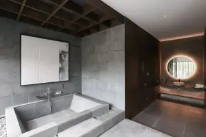 Và trên hệ khung không gian hòa trộn thật nhuần nhuyễn các thành tố hình khối, tỷ lệ và nhịp điệu chuẩn xác ấy, bảng màu được khéo dùng từ xám trắng đến nâu nhạt đã thực sự tạo nên một đẳng cấp riêng biệt cho ngôi nhà này.
