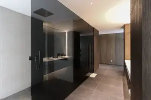 Phần nhà xe được đẩy ra ngoài, nhiều không gian giải trí, quầy bar, bếp với khu ăn trong và ngoài hiên, phòng tập thể dục, chăm sóc sức khỏe… được đan cài vào trục không gian sẵn có. Thủ pháp phân chia tạo nên hệ cấu trúc nhiều tầng lớp đóng mở to nhỏ khác nhau, tạo cảm giác nhìn trên mặt bằng rất nhiều phòng ốc và công năng, nhưng khi đi vào thực tế thì lại khá rạch ròi gọn ghẽ, như chiếc hộp khéo gói ghém và cũng khéo mở ra vô số các góc sinh hoạt thú vị mà không gây “choáng ngợp” cho người sử dụng.