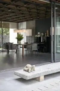 Giải pháp đan cài, xen cấy từ các đơn vị cơ bản (mô – đun hóa) này còn đem lại hiệu quả biểu hiện trong xử lý hoàn thiện không gian. Có thể kể đến hệ khung trần ô ca rô lan từ phòng khách đến mái hiên, hay khối tủ bếp, quầy bar, hệ bàn ghế… đều thấp thoáng phong vị tối giản mộc mạc của vùng nhiệt đới