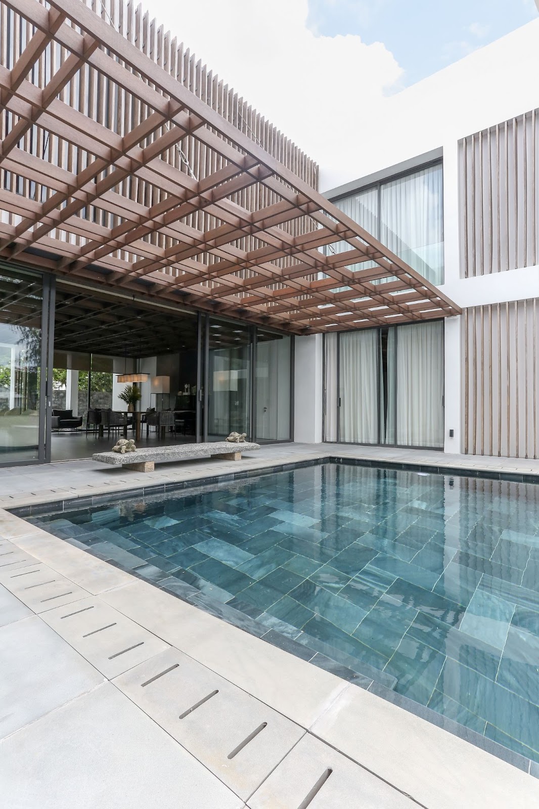 Khối nhà vừa đóng vừa mở ra hồ bơi trung tâm, kết nối các sinh hoạt chung quanh