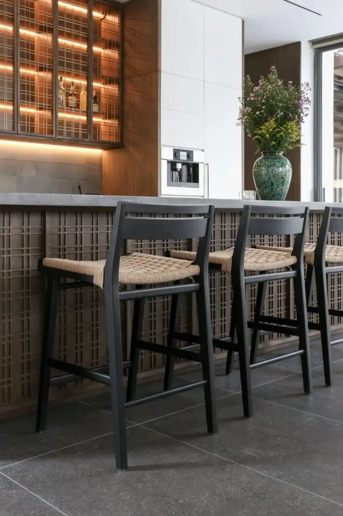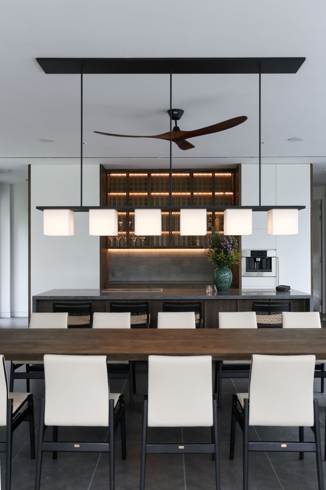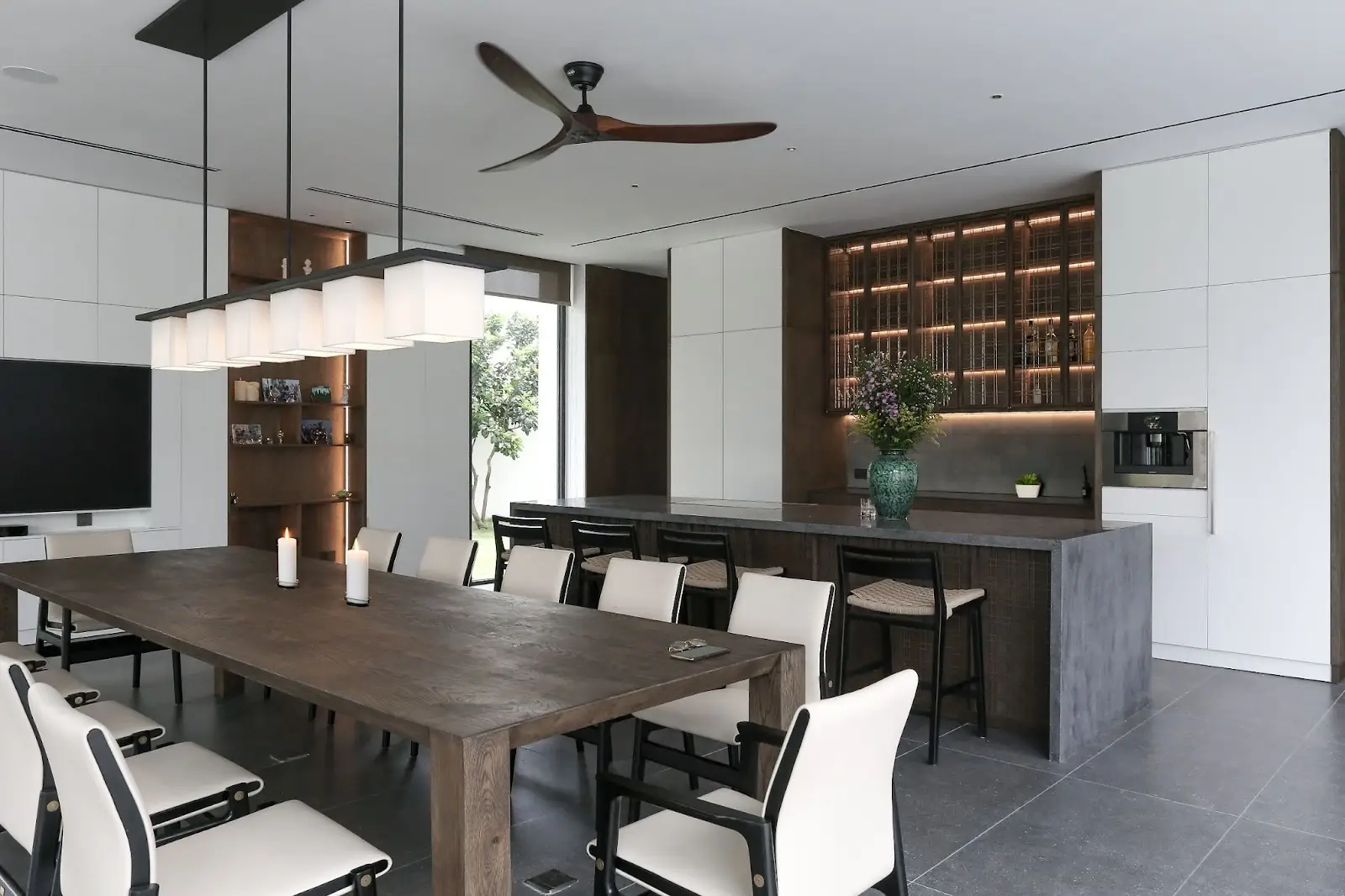 Giải pháp đan cài, xen cấy từ các đơn vị cơ bản (mô – đun hóa) này còn đem lại hiệu quả biểu hiện trong xử lý hoàn thiện không gian. Có thể kể đến hệ khung trần ô ca rô lan từ phòng khách đến mái hiên, hay khối tủ bếp, quầy bar, hệ bàn ghế… đều thấp thoáng phong vị tối giản mộc mạc của vùng nhiệt đới