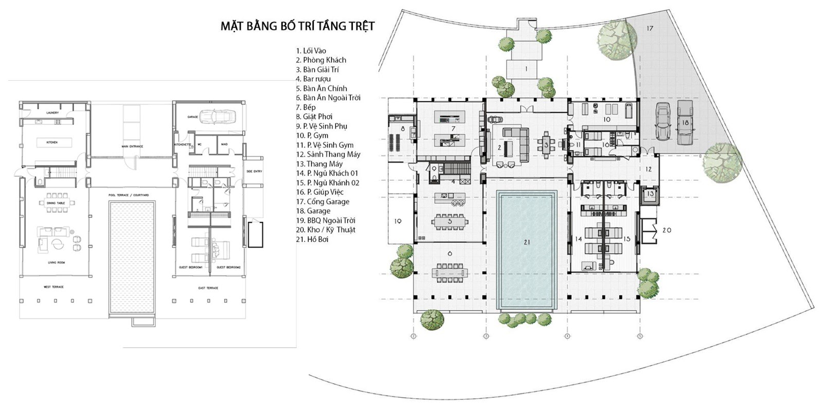Phần nhà xe được đẩy ra ngoài, nhiều không gian giải trí, quầy bar, bếp với khu ăn trong và ngoài hiên, phòng tập thể dục, chăm sóc sức khỏe… được đan cài vào trục không gian sẵn có. Thủ pháp phân chia tạo nên hệ cấu trúc nhiều tầng lớp đóng mở to nhỏ khác nhau, tạo cảm giác nhìn trên mặt bằng rất nhiều phòng ốc và công năng, nhưng khi đi vào thực tế thì lại khá rạch ròi gọn ghẽ, như chiếc hộp khéo gói ghém và cũng khéo mở ra vô số các góc sinh hoạt thú vị mà không gây “choáng ngợp” cho người sử dụng.