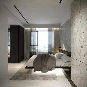 Chỉ có một phòng ngủ chính được giữ lại. Thay vào đó, phòng ngủ còn lại được biến tấu thành phòng đọc sách liên thông cùng phòng ngủ chính bằng hệ cửa lùa âm vách. Thiết kế này còn có mục đích chính khác nữa đó là tạo phòng dự bị cho trẻ sơ sinh với sự riêng tư cần thiết.