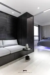 Sự tối giản và tinh tế không những thể hiện ở tổng quan căn hộ mà còn xuất hiện trên từng đường nét nội thất và cách vận dụng vật liệu, lẫn màu sắc vào thiết kế. Vật liệu chính là veneer đen có bề mặt gồ ghề vẫn giữ được nét tự nhiên vốn có của gỗ, tuy nhiên nó không ảnh hưởng nhiều đến vấn đề vệ sinh lau dọn. Khi được kết hợp thêm với ánh sáng đã tạo nên những hiệu ứng bóng đổ theo ngụ ý của KTS. Sàn gỗ engineer vì để có tone trắng phù hợp với màu trắng chủ đạo của cả căn hộ, đã được đặt làm riêng theo yêu cầu