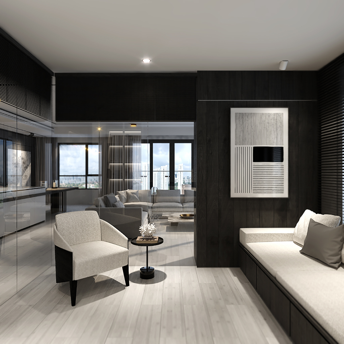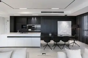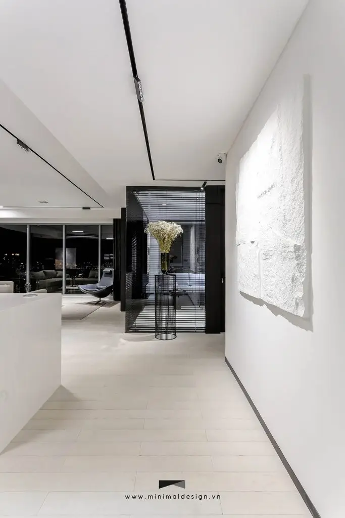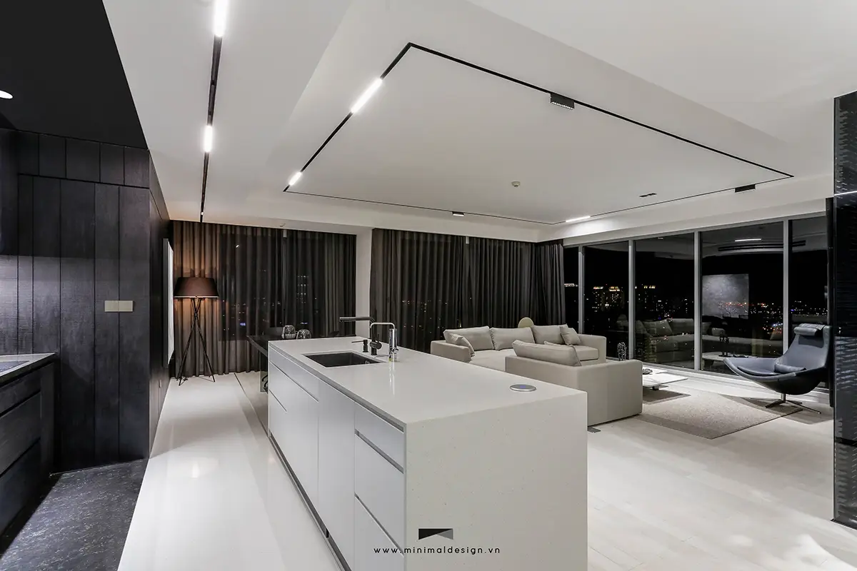 Không gian căn hộ với thiết kế hiện đại, sử dụng hai màu đen và trắng chủ đạo