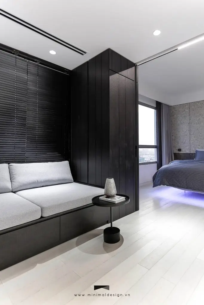 Căn hộ 108m2 với view đắt giá nhìn ra sông Sài Gòn thuộc sở hữu của một cặp vợ chồng trẻ. Đội ngũ thiết kế đã tạo nên một không gian sống với hai tone màu đen và trắng đầy cá tính. Sự kết hợp nhịp nhàng giữa đường nét gãy gọn và hình khối tối giản càng tôn lên vẻ đẹp kiến trúc hiện đại của căn hộ.