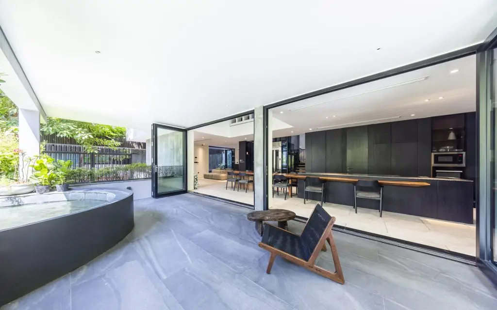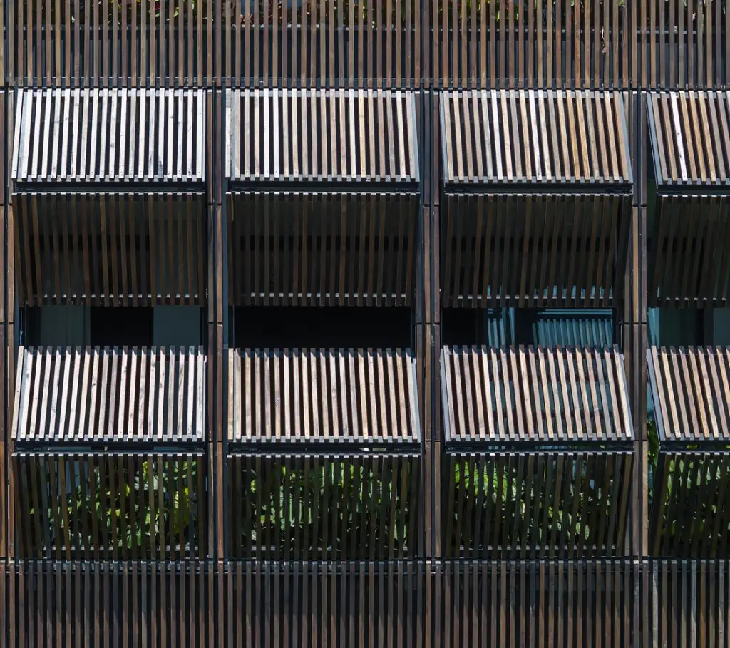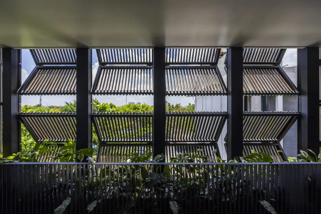 Xung quanh ngôi nhà, những chậu hoa bằng bê tông cốt thép được gắn vào hệ khung hiện có, tạo thêm những lớp cây xanh ở các độ cao khác nhau. Mặt tiền của tòa nhà được bao phủ bởi hệ thống các thanh gỗ sơn đen có thể đóng mở linh hoạt, vừa tạo bóng mát vừa tạo sự riêng tư, đồng thời đóng vai trò chính trong việc định hình kiến trúc của công trình. Toàn bộ tòa nhà có hình dạng như một chiếc hộp đen – tĩnh lặng và vững chắc, bao trùm sức sống tỏa ra từ bên trong.