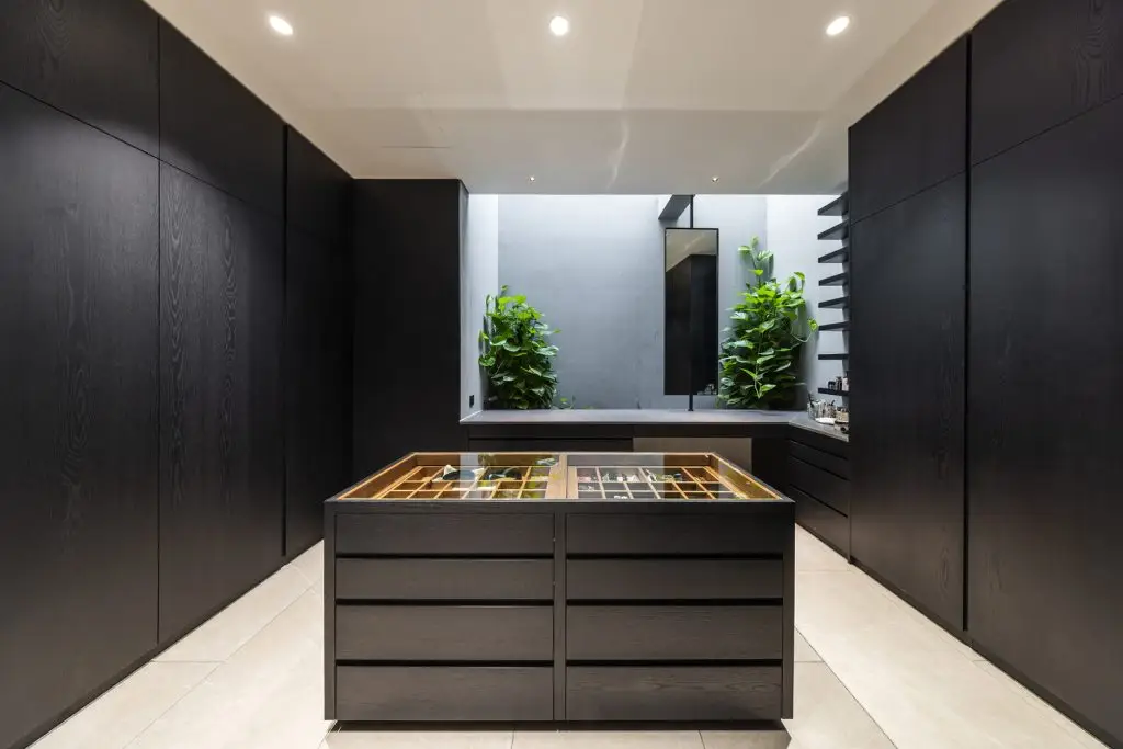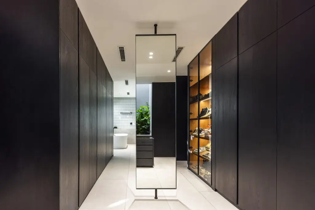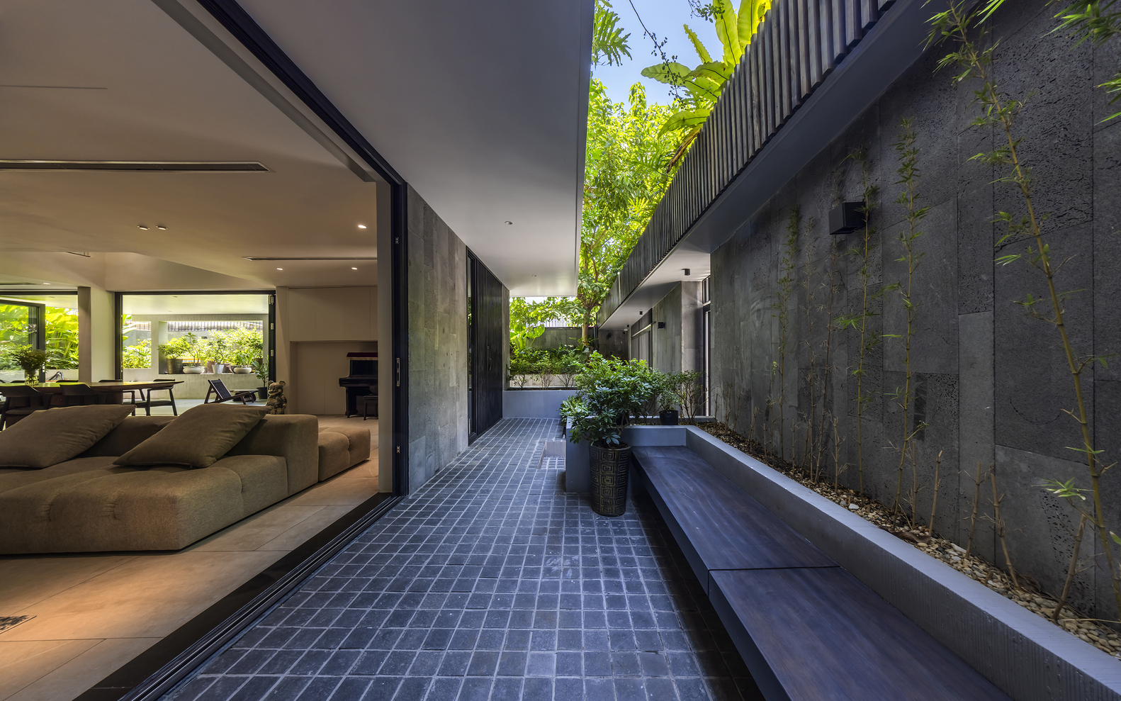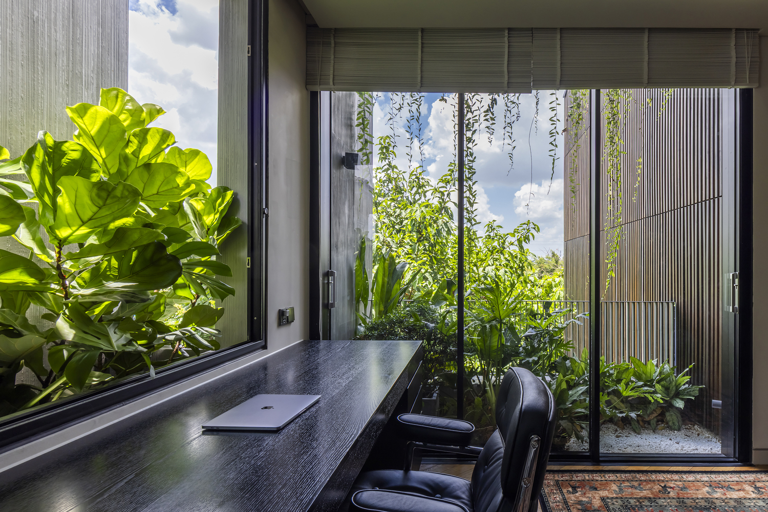 Xung quanh ngôi nhà, những chậu hoa bằng bê tông cốt thép được gắn vào hệ khung hiện có, tạo thêm những lớp cây xanh ở các độ cao khác nhau. Mặt tiền của tòa nhà được bao phủ bởi hệ thống các thanh gỗ sơn đen có thể đóng mở linh hoạt, vừa tạo bóng mát vừa tạo sự riêng tư, đồng thời đóng vai trò chính trong việc định hình kiến trúc của công trình. Toàn bộ tòa nhà có hình dạng như một chiếc hộp đen – tĩnh lặng và vững chắc, bao trùm sức sống tỏa ra từ bên trong.