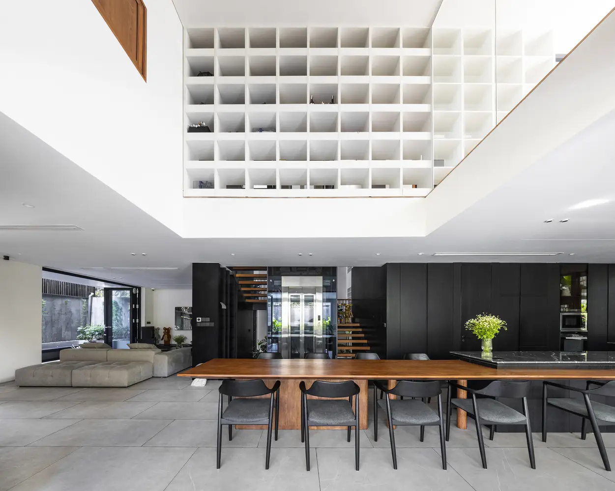 Mô tả bằng văn bản do các kiến trúc sư cung cấp. Tọa lạc tại một khu dân cư ven sông yên tĩnh, cách xa trung tâm thành phố, Black Cube House là dự án cải tạo một ngôi nhà phố bốn tầng, được xây dựng vào năm 2019. Ngôi nhà có ba mặt thoáng và tầm nhìn rộng ra sông Sài Gòn. Tuy nhiên, cách bố trí không gian cũ khiến ngôi nhà thiếu ánh sáng, ngột ngạt và không phù hợp với lối sống mở và gần gũi với thiên nhiên của chủ nhà.