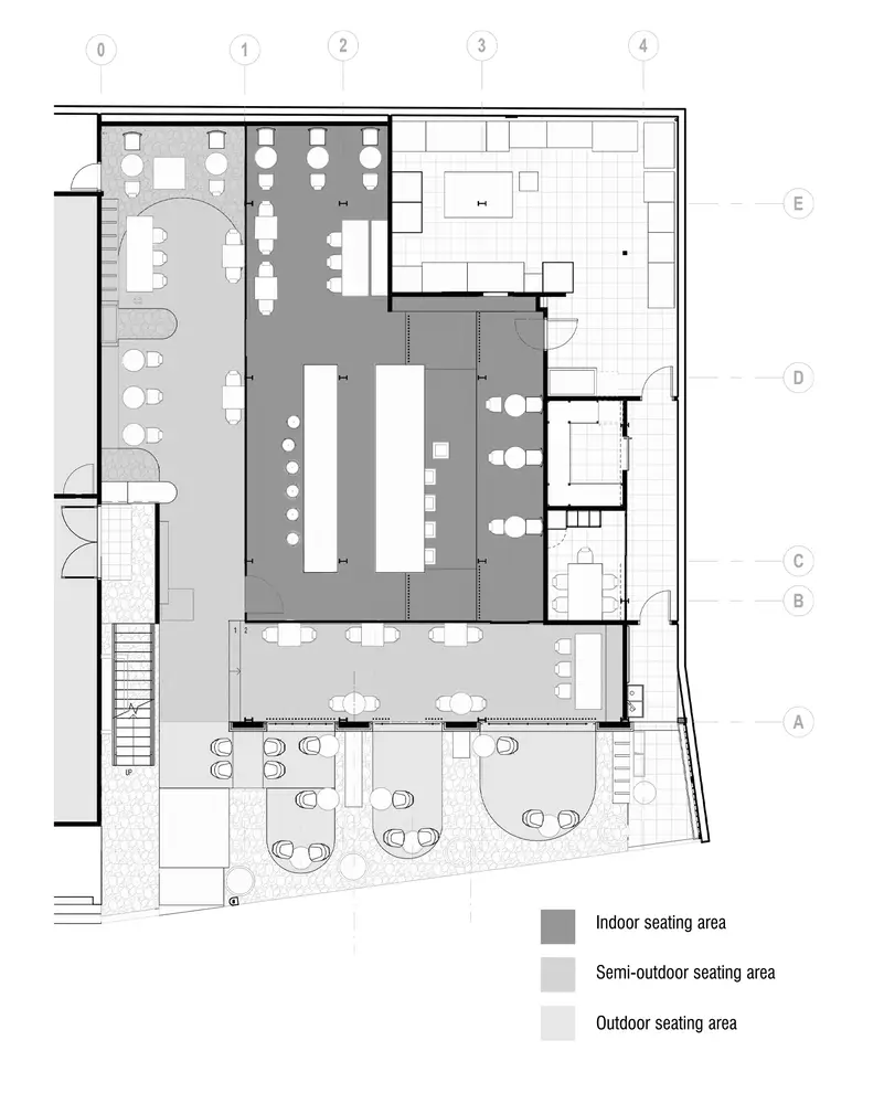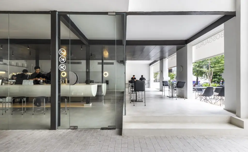 Quán cà phê rang xay Bosgaurus tin tưởng vào sự minh bạch để thể hiện quy trình pha chế cà phê của mình, và tinh thần đó đã được thể hiện một cách tinh tế thông qua kiến trúc. Sự kết nối trực quan liền mạch giữa các khu vực chỗ ngồi trong nhà, bán ngoài trời và ngoài trời được tạo ra bằng cách sử dụng kính cường lực không khung từ sàn đến trần. Nội thất rời bằng thép không gỉ được thiết kế riêng, nhẹ và mỏng để cân bằng sự đồ sộ của quầy bar.