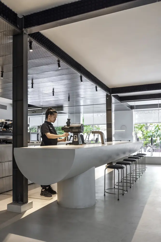 Nắm bắt cả câu chuyện của khách hàng và bối cảnh địa phương, chúng tôi đã đề xuất một thiết kế xoay quanh ý tưởng về một “sân khấu biểu diễn”, với tầm nhìn nâng tầm nghệ thuật pha chế cà phê và các barista, biến họ thành những nghệ sĩ trình diễn thể hiện tài năng của mình. Quy hoạch không gian chiến lược đã dẫn chúng tôi đến việc biến quầy bar thành một sân khấu. Sân khấu bao gồm hai yếu tố chính: quầy bar lớn và điểm nhấn đặc trưng của thương hiệu khách hàng, “quầy bar bay”. Quầy bar bay được đỡ bởi một kết cấu duy nhất làm từ móng bê tông nặng 2 tấn để tạo hiệu ứng bay lơ lửng. Vì chúng tôi muốn tạo ra nhiều hình thức tương tác khác nhau giữa người biểu diễn và khán giả, một số ở tầm mắt và một số từ góc nhìn cao hơn, chúng tôi đã thử nghiệm với các độ cao khác nhau để đạt được cách tiếp cận sáng tạo này.