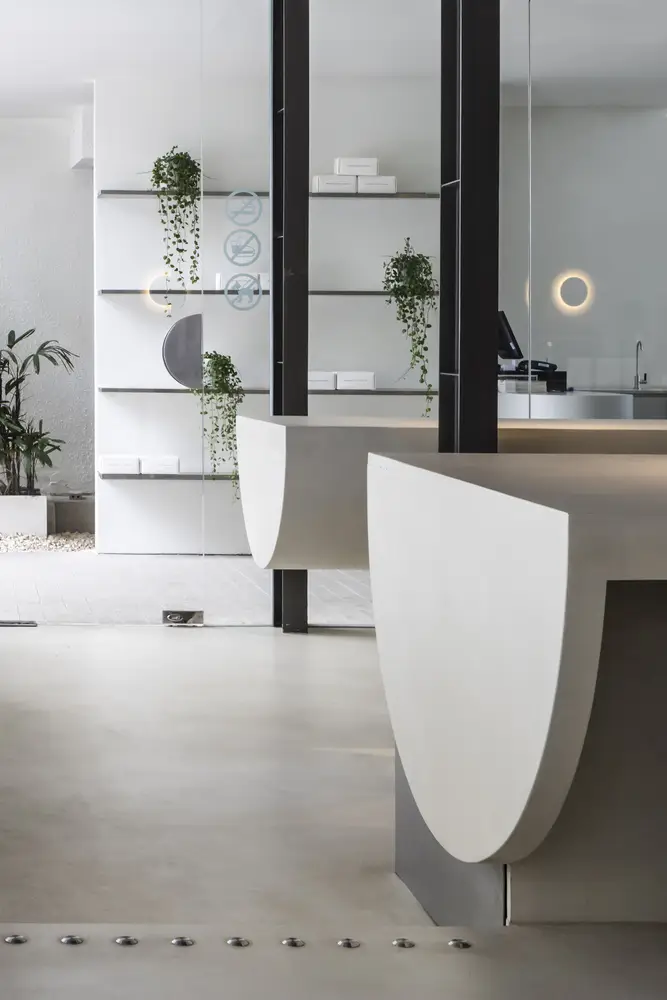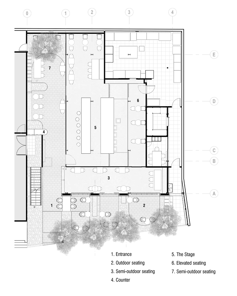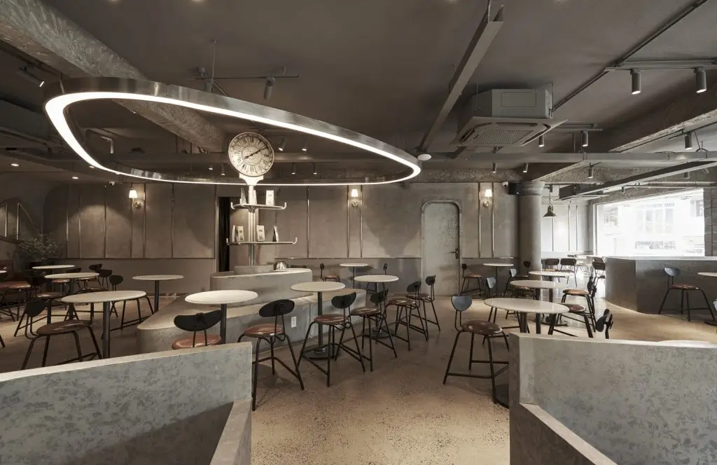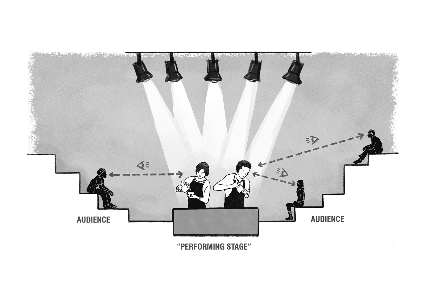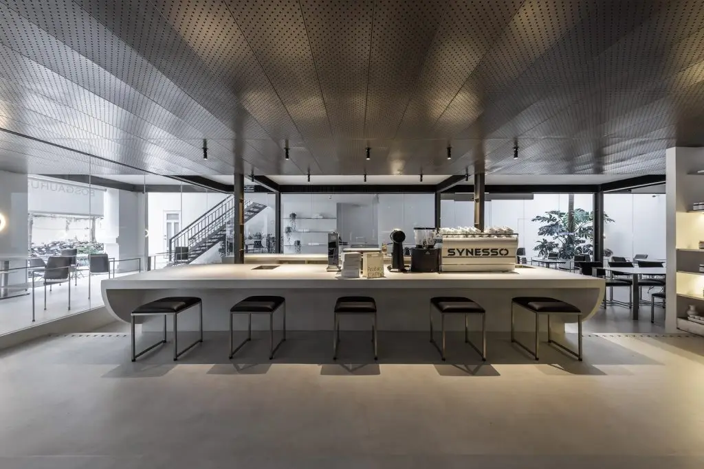 Nắm bắt cả câu chuyện của khách hàng và bối cảnh địa phương, chúng tôi đã đề xuất một thiết kế xoay quanh ý tưởng về một “sân khấu biểu diễn”, với tầm nhìn nâng tầm nghệ thuật pha chế cà phê và các barista, biến họ thành những nghệ sĩ trình diễn thể hiện tài năng của mình. Quy hoạch không gian chiến lược đã dẫn chúng tôi đến việc biến quầy bar thành một sân khấu. Sân khấu bao gồm hai yếu tố chính: quầy bar lớn và điểm nhấn đặc trưng của thương hiệu khách hàng, “quầy bar bay”. Quầy bar bay được đỡ bởi một kết cấu duy nhất làm từ móng bê tông nặng 2 tấn để tạo hiệu ứng bay lơ lửng. Vì chúng tôi muốn tạo ra nhiều hình thức tương tác khác nhau giữa người biểu diễn và khán giả, một số ở tầm mắt và một số từ góc nhìn cao hơn, chúng tôi đã thử nghiệm với các độ cao khác nhau để đạt được cách tiếp cận sáng tạo này.
