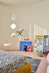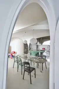 Bên trong phòng ngủ, không gian mở – phòng ngủ, phòng tắm được kết nối không cửa và chỉ được ngăn cách bằng đường cong hoặc vách kính. Cửa sổ hoặc lối ra ban công được che phủ bằng đường cong để loại bỏ những đường thẳng thường thấy. Căn hộ này sử dụng nhiều màu sắc từ đồ nội thất, và nhiều hình khối theo ngôn ngữ thiết kế Retro, Retro Future, Space-Age.