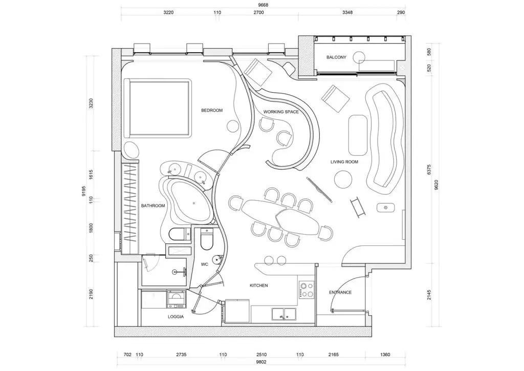 Bước vào từ lối vào, chúng tôi tạo ra một vùng đệm trước Hang Động Giấc Mơ. Bên trong hang động là một lối đi không có cửa dẫn đến các khu vực khác. Có một hang động nhỏ hơn ngay chính giữa căn hộ: khu vực làm việc cũng là điểm nhấn; bởi vì hang động này sẽ “gây ồn ào” cho các bữa tiệc (DJ là sở thích của chủ nhà). Đối diện với hang động nhỏ đó là phòng khách với bộ sofa khổng lồ lấy cảm hứng từ ngôn ngữ của Thời đại Không gian, với một vài chậu cây cam trong căn hộ chủ yếu màu trắng.