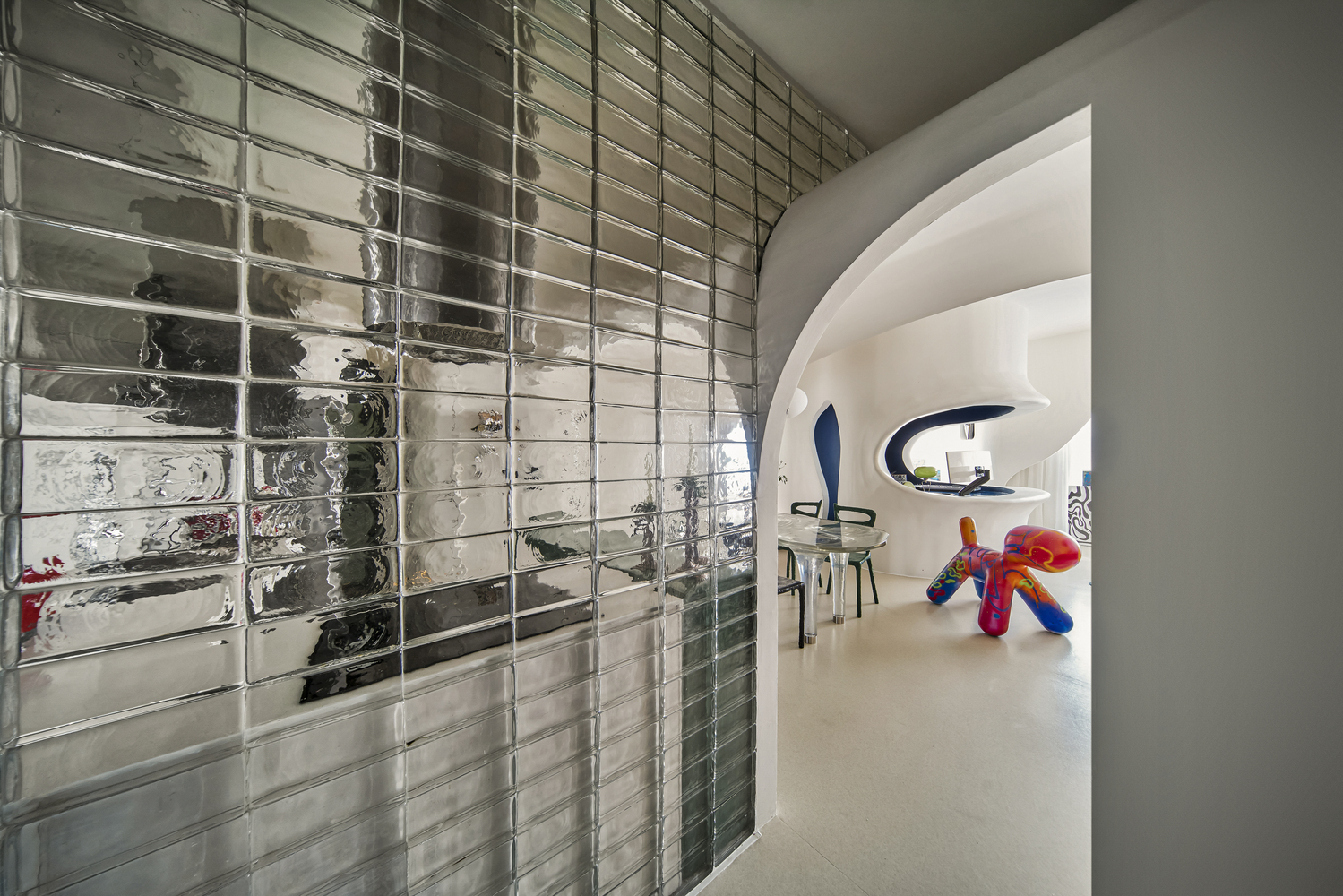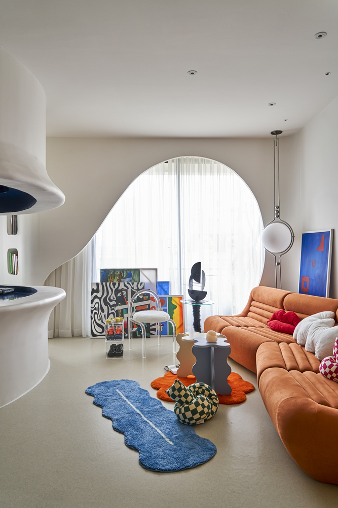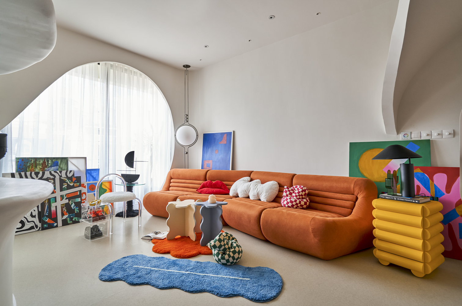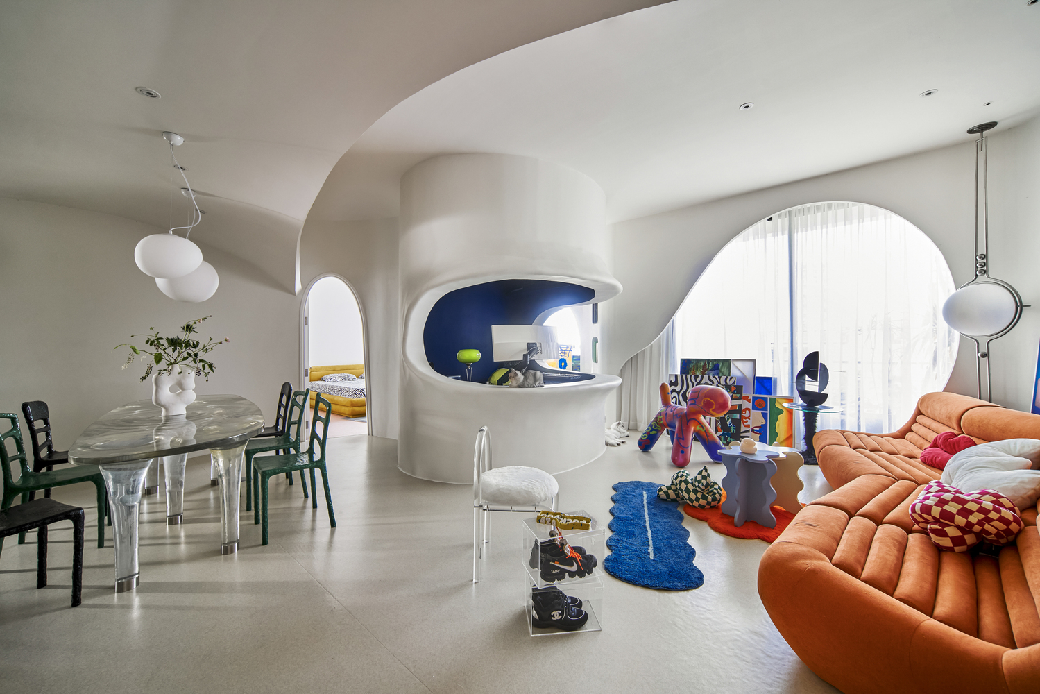Bước vào từ lối vào, chúng tôi tạo ra một vùng đệm trước Hang Động Giấc Mơ. Bên trong hang động là một lối đi không có cửa dẫn đến các khu vực khác. Có một hang động nhỏ hơn ngay chính giữa căn hộ: khu vực làm việc cũng là điểm nhấn; bởi vì hang động này sẽ “gây ồn ào” cho các bữa tiệc (DJ là sở thích của chủ nhà). Đối diện với hang động nhỏ đó là phòng khách với bộ sofa khổng lồ lấy cảm hứng từ ngôn ngữ của Thời đại Không gian, với một vài chậu cây cam trong căn hộ chủ yếu màu trắng.