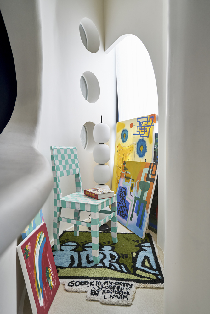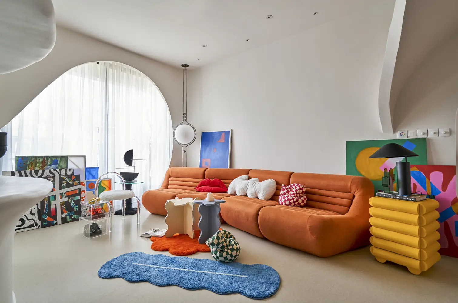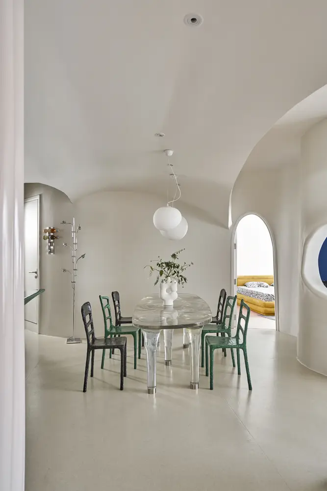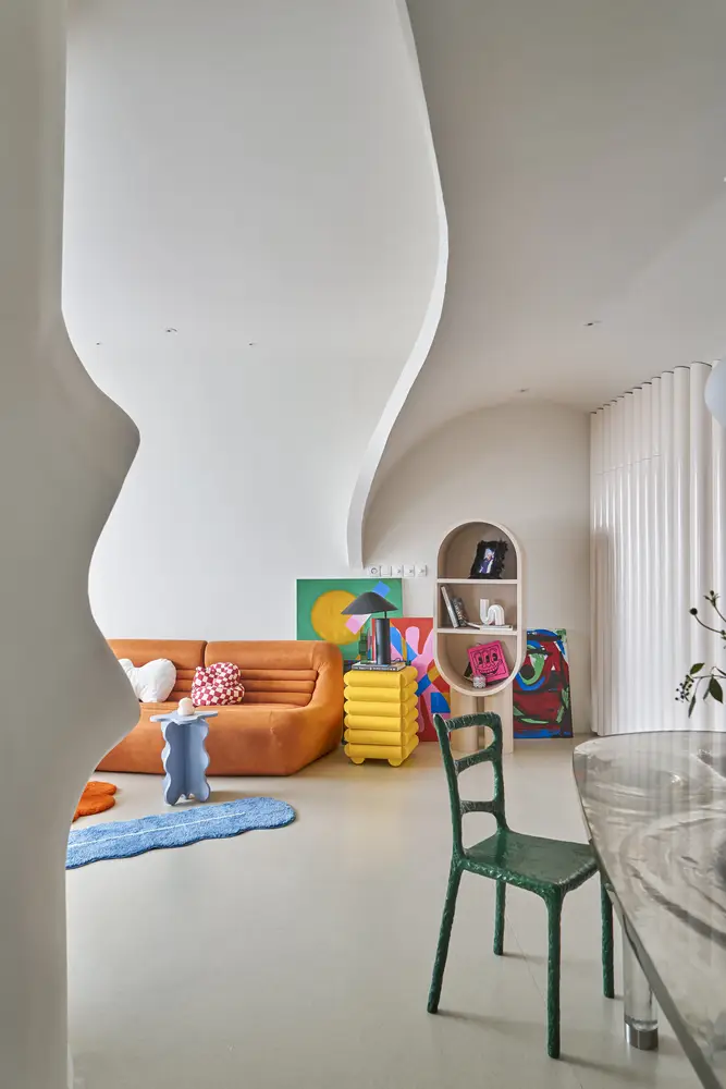 Bước vào từ lối vào, chúng tôi tạo ra một vùng đệm trước Hang Động Giấc Mơ. Bên trong hang động là một lối đi không có cửa dẫn đến các khu vực khác. Có một hang động nhỏ hơn ngay chính giữa căn hộ: khu vực làm việc cũng là điểm nhấn; bởi vì hang động này sẽ “gây ồn ào” cho các bữa tiệc (DJ là sở thích của chủ nhà). Đối diện với hang động nhỏ đó là phòng khách với bộ sofa khổng lồ lấy cảm hứng từ ngôn ngữ của Thời đại Không gian, với một vài chậu cây cam trong căn hộ chủ yếu màu trắng.