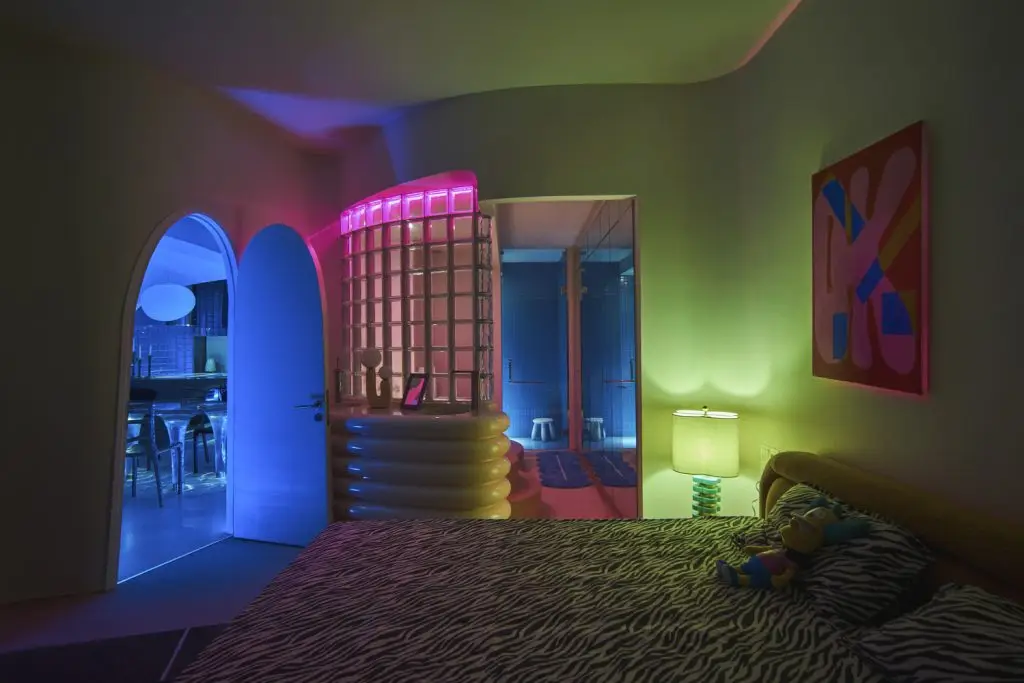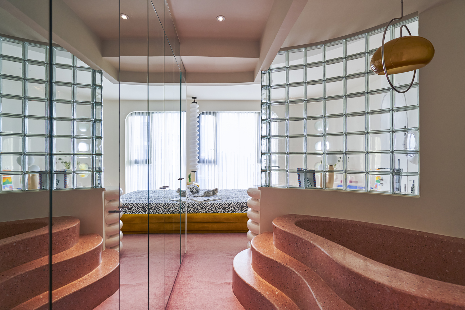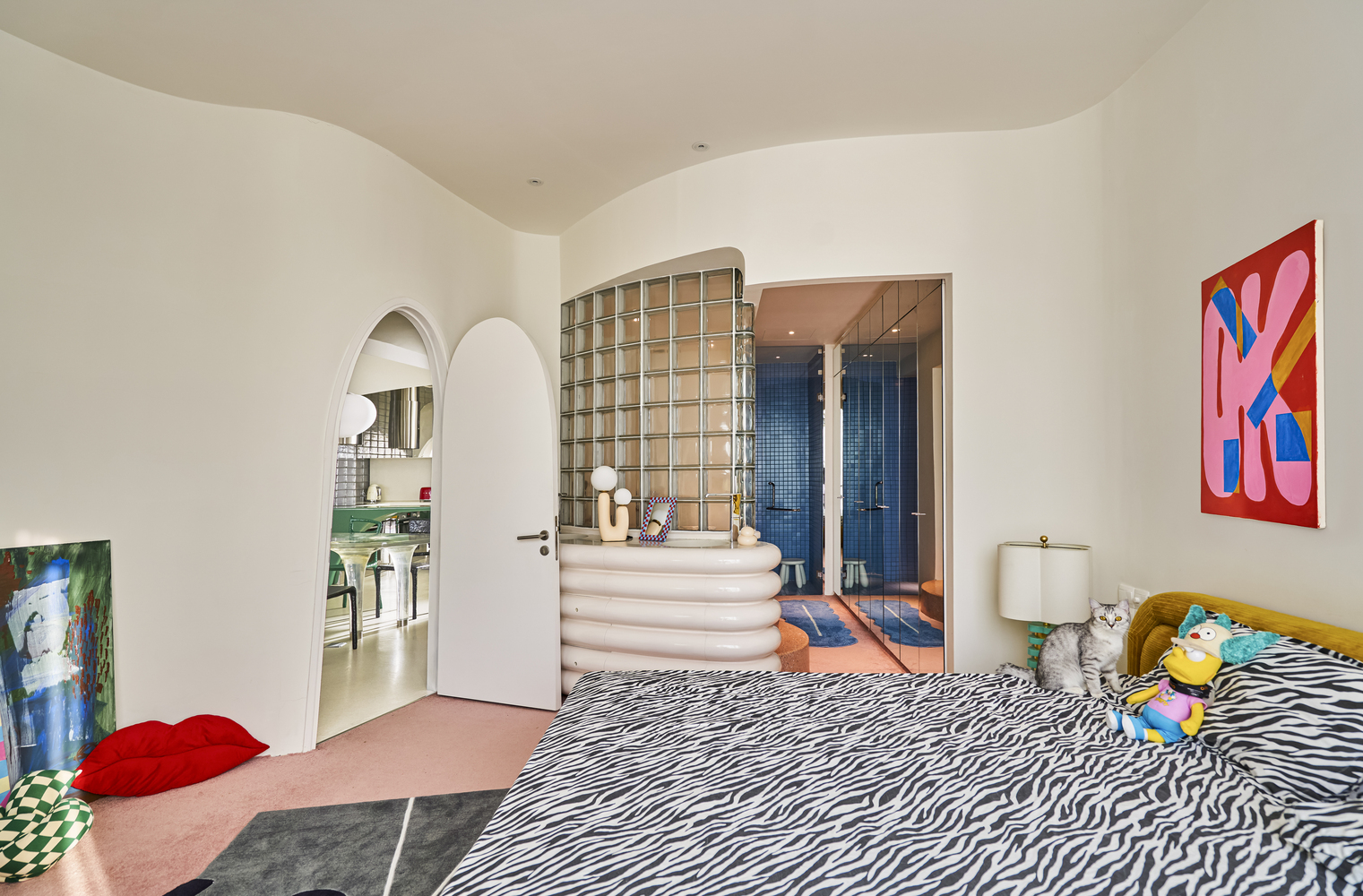 Bên trong phòng ngủ, không gian mở – phòng ngủ, phòng tắm được kết nối không cửa và chỉ được ngăn cách bằng đường cong hoặc vách kính. Cửa sổ hoặc lối ra ban công được che phủ bằng đường cong để loại bỏ những đường thẳng thường thấy. Căn hộ này sử dụng nhiều màu sắc từ đồ nội thất, và nhiều hình khối theo ngôn ngữ thiết kế Retro, Retro Future, Space-Age.