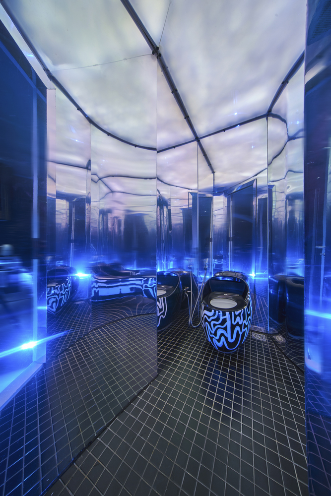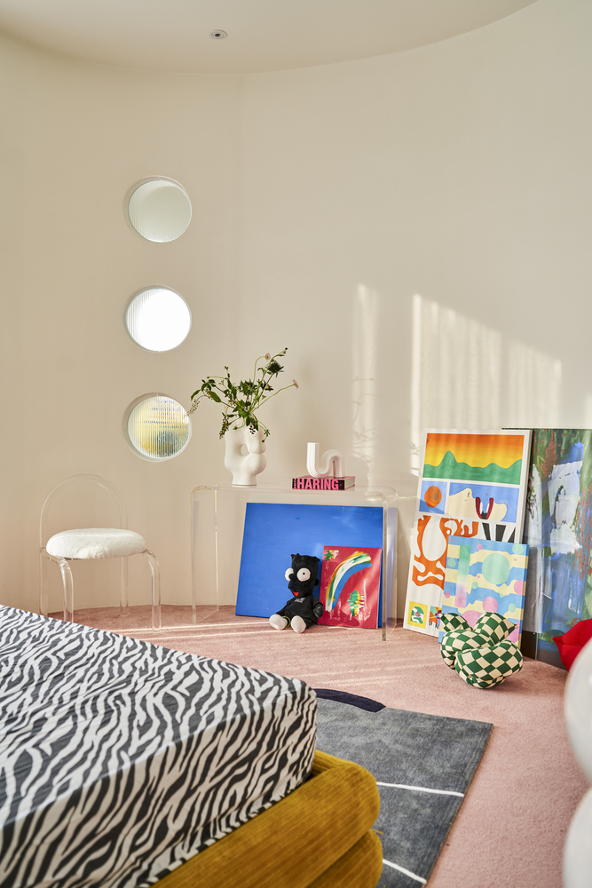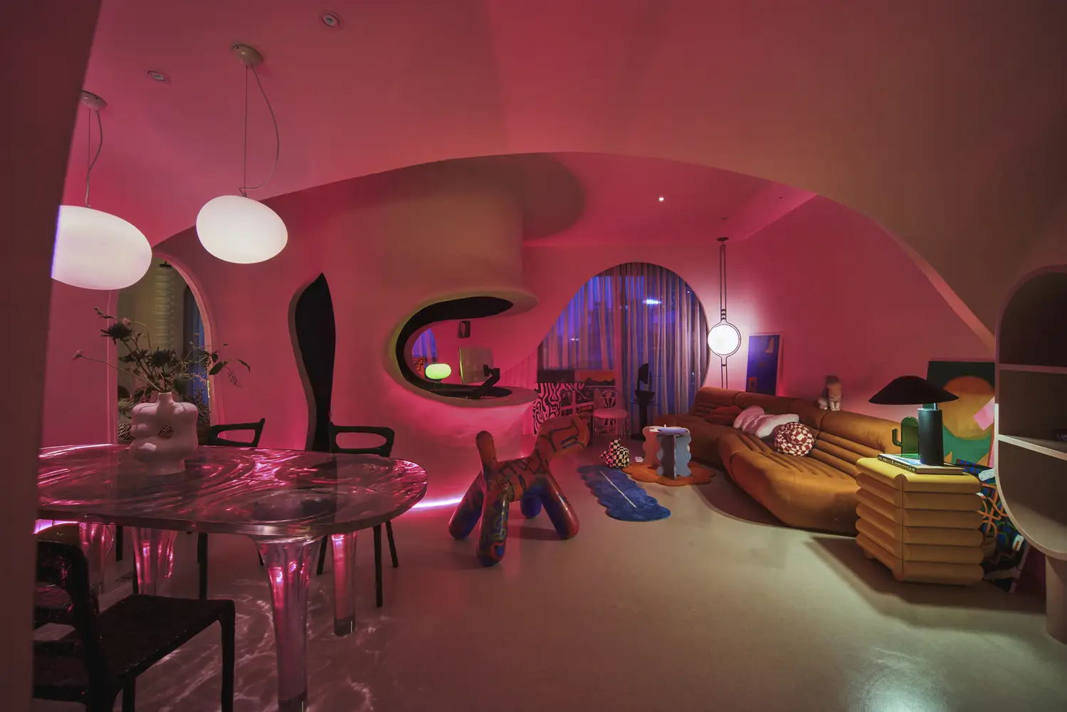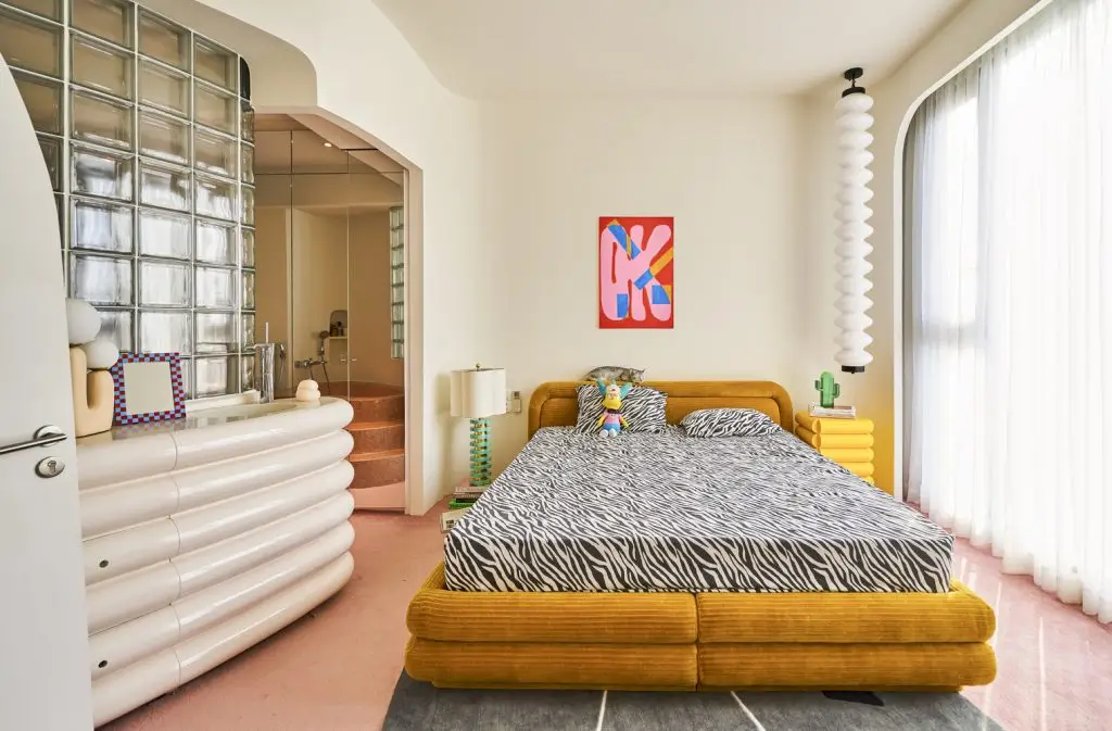 Bên trong phòng ngủ, không gian mở – phòng ngủ, phòng tắm được kết nối không cửa và chỉ được ngăn cách bằng đường cong hoặc vách kính. Cửa sổ hoặc lối ra ban công được che phủ bằng đường cong để loại bỏ những đường thẳng thường thấy. Căn hộ này sử dụng nhiều màu sắc từ đồ nội thất, và nhiều hình khối theo ngôn ngữ thiết kế Retro, Retro Future, Space-Age.