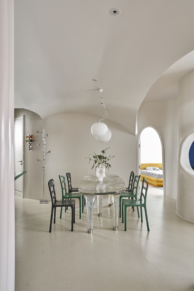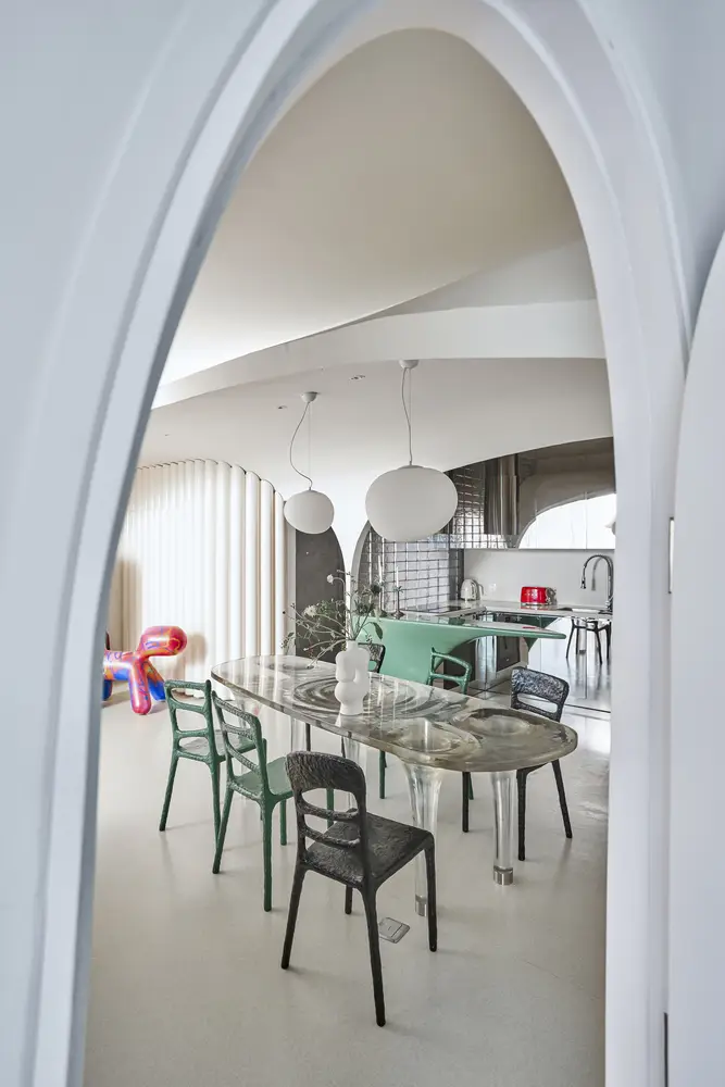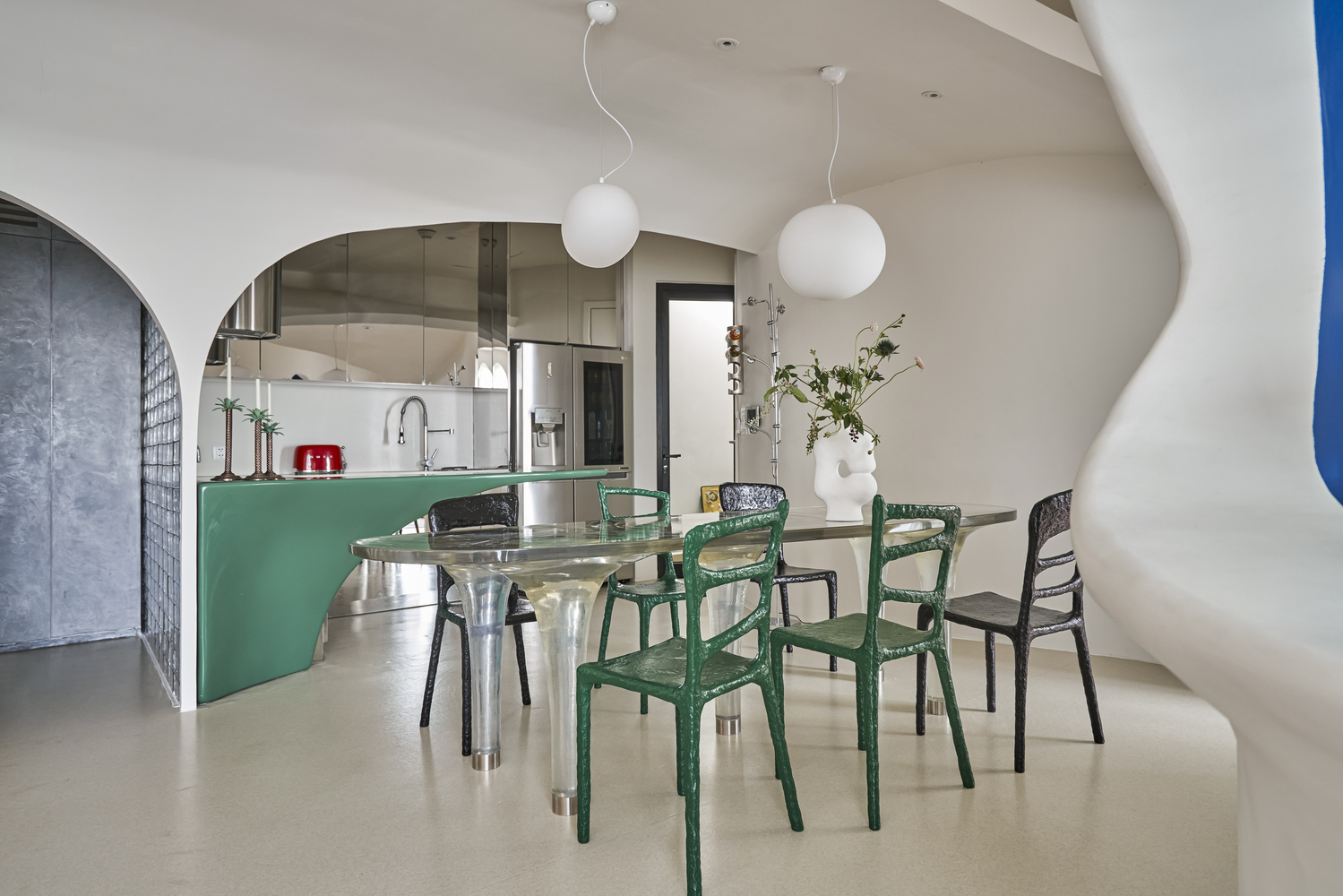 Bên cạnh khu vực làm việc, chúng tôi đặt một góc nhỏ mang tên “Góc Tự Kỷ”, nằm sát một góc nhỏ của căn hộ và có cửa sổ để không làm ảnh hưởng đến không gian xung quanh. Phía bên kia của “hang động” nhỏ, chúng tôi có một “hang động” mở ở lối vào – nơi có bếp và phòng ăn. Điểm nhấn của khu vực này là nội thất vừa mang phong cách cổ điển vừa hiện đại với chất liệu acrylic sơn xanh lá cây và thép không gỉ, bàn ăn bằng nhựa lấy cảm hứng từ nước, tạo hiệu ứng ánh sáng trông như mặt nước.
